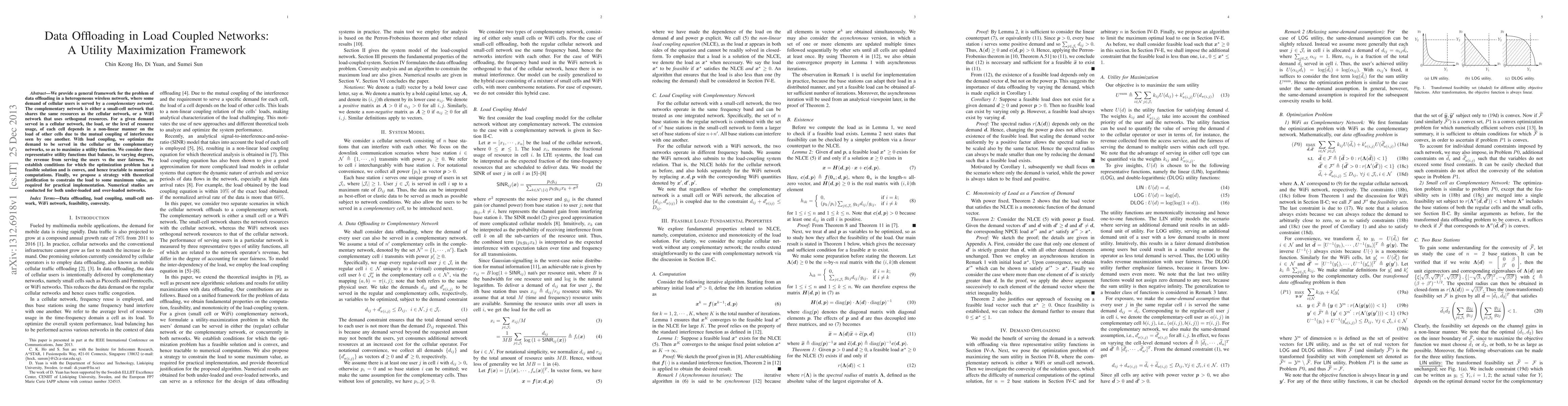 We provide a general framework for the problem of data offloading in a heterogeneous wireless network, where some demand of cellular users is served by a complementary network. The complementary network is either a small-cell network that shares the same resources as the cellular network, or a WiFi network that uses orthogonal resources. For a given demand served in a cellular network, the load, or the level of resource usage, of each cell depends in a non-linear manner on the load of other cells due to the mutual coupling of interference seen by one another. With load coupling, we optimize the demand to be served in the cellular or the complementary networks, so as to maximize a utility function. We consider three representative utility functions that balance, to varying degrees, the revenue from serving the users vs the user fairness. We establish conditions for which the optimization problem has a feasible solution and is convex, and hence tractable to numerical computations. Finally, we propose a strategy with theoretical justification to constrain the load to some maximum value, as required for practical implementation. Numerical studies are conducted for both under-loaded and over-loaded networks.