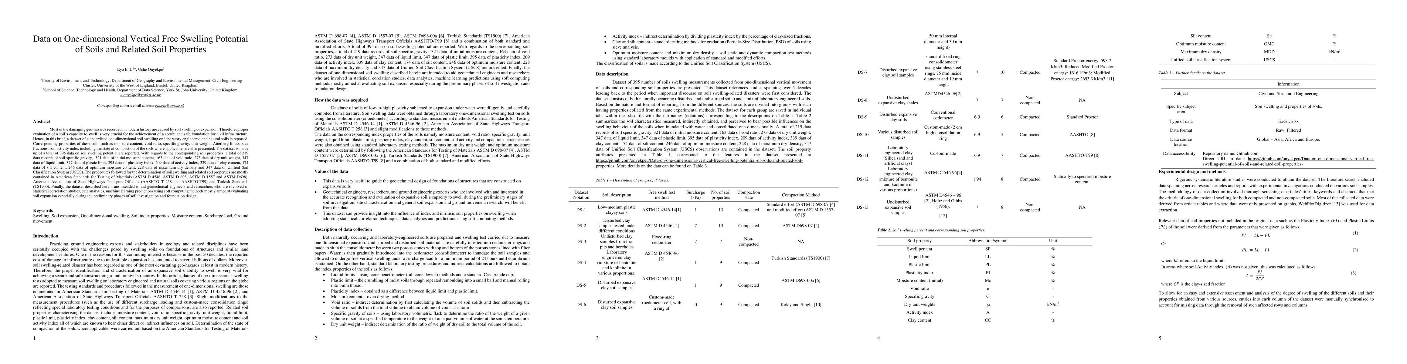 Most of the damaging geo-hazards recorded in modern history are caused by soil swelling or expansion. Therefore, proper evaluation of a soils capacity to swell is very crucial for the achievement of a secure and safe foundation for civil infrastructure. Hence, in this brief, a dataset of standardised one-dimensional soil swelling on laboratory engineered and natural soils is reported. Corresponding properties of these soils such as moisture content, void ratio, specific gravity, unit weight, Atterberg limits, size fractions, soil activity index including the state of compaction of the soils where applicable, are also presented. The dataset is made up of a total of 395 data on soil swelling potential are reported. With regards to the corresponding soil properties, a total of 219 data records of soil specific gravity, 321 data of initial moisture content, 163 data of void ratio, 273 data of dry unit weight, 347 data of liquid limit, 347 data of plastic limit, 395 data of plasticity index, 209 data of activity index, 339 data of clay content, 174 data of silt content, 246 data of optimum moisture content, 228 data of maximum dry density and 347 data of Unified Soil Classification System (USCS). The procedures followed for the determination of soil swelling and related soil properties are mostly contained in American Standards for Testing of Materials (ASTM D 4546, ASTM D 698, ASTM D 1557 and ASTM D698), American Association of State Highways Transport Officials (AASHTO T 258 and AASHTO-T99) and Turkish Standards (TS1900). Finally, the dataset described herein are intended to aid geotechnical engineers and researchers who are involved in statistical correlation studies, data analytics, machine learning predictions using soft computing methods mostly aimed at evaluating soil expansion especially during the preliminary phases of soil investigation and foundation design.