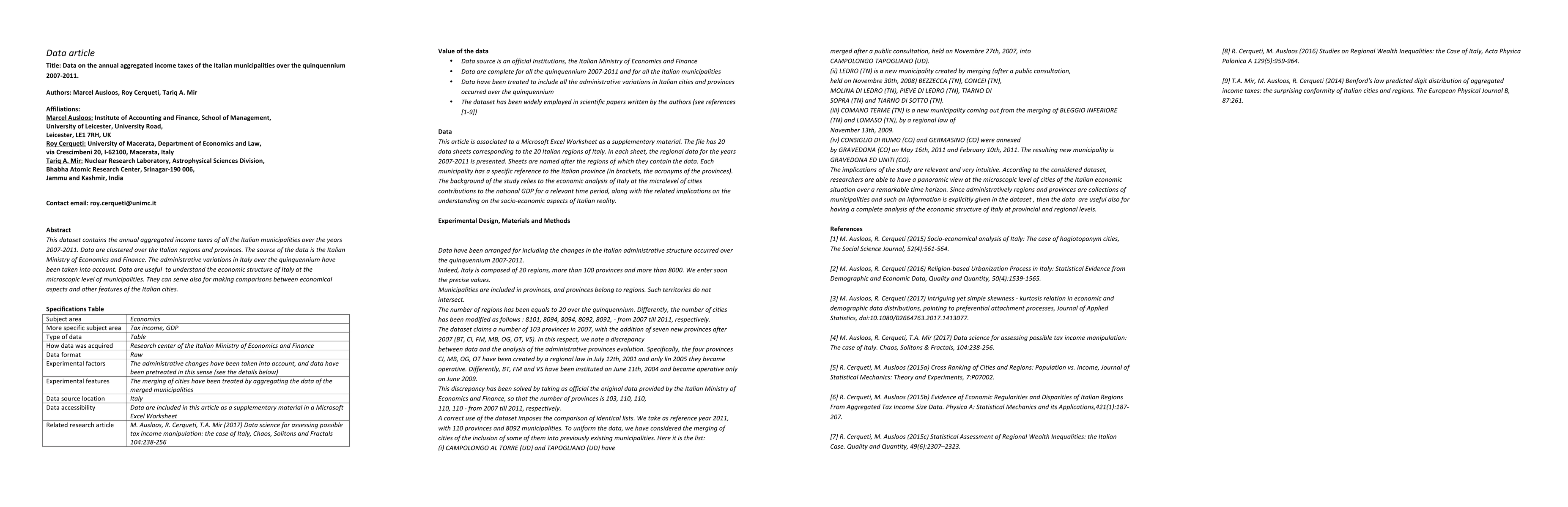 This dataset contains the annual aggregated income taxes of all the Italian municipalities over the years 2007-2011. Data are clustered over the Italian regions and provinces. The source of the data is the Italian Ministry of Economics and Finance. The administrative variations in Italy over the quinquennium have been taken into account. Data are useful to understand the economic structure of Italy at the microscopic level of municipalities. They can serve also for making comparisons between economical aspects and other features of the Italian cities.