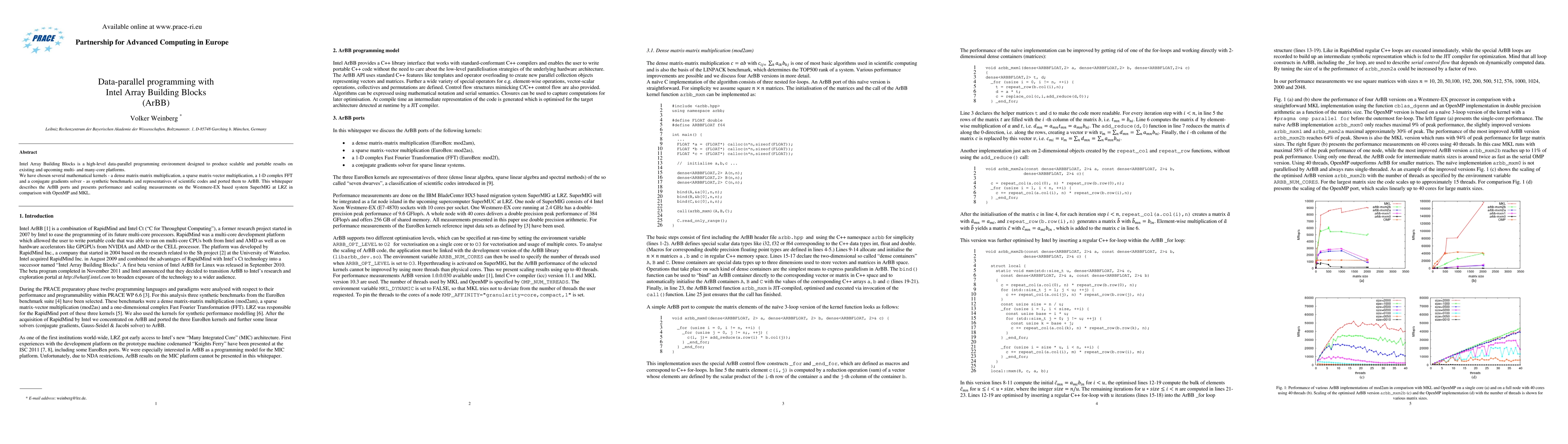 Summary: Intel Array Building Blocks (ArBB) facilitates high-level data-parallel programming for scalable and portable performance across multi-core platforms. The paper benchmarks ArBB against OpenMP and MKL using mathematical kernels like dense matrix multiplication and conjugate gradients on a SuperMIG system.