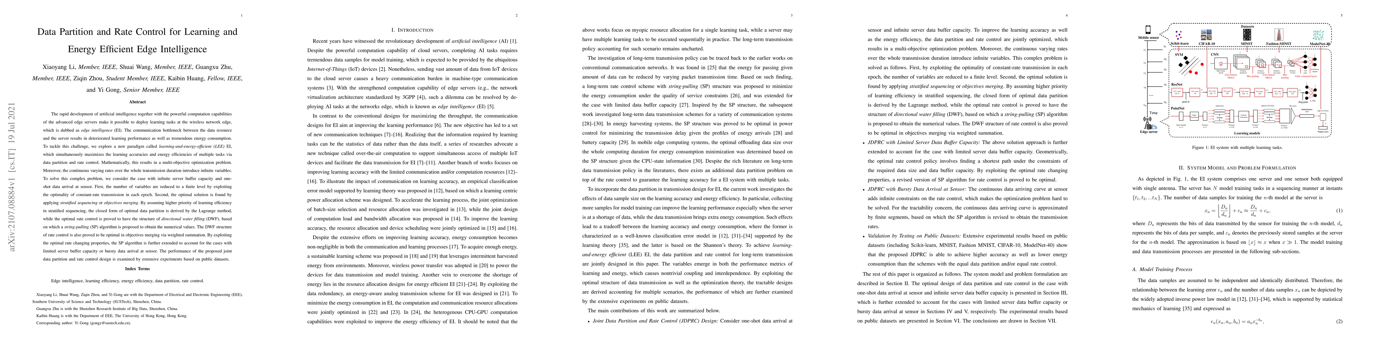 The rapid development of artificial intelligence together with the powerful computation capabilities of the advanced edge servers make it possible to deploy learning tasks at the wireless network edge, which is dubbed as edge intelligence (EI). The communication bottleneck between the data resource and the server results in deteriorated learning performance as well as tremendous energy consumption. To tackle this challenge, we explore a new paradigm called learning-and-energy-efficient (LEE) EI, which simultaneously maximizes the learning accuracies and energy efficiencies of multiple tasks via data partition and rate control. Mathematically, this results in a multi-objective optimization problem. Moreover, the continuous varying rates over the whole transmission duration introduce infinite variables. To solve this complex problem, we consider the case with infinite server buffer capacity and one-shot data arrival at sensor. First, the number of variables are reduced to a finite level by exploiting the optimality of constant-rate transmission in each epoch. Second, the optimal solution is found by applying stratified sequencing or objectives merging. By assuming higher priority of learning efficiency in stratified sequencing, the closed form of optimal data partition is derived by the Lagrange method, while the optimal rate control is proved to have the structure of directional water filling (DWF), based on which a string-pulling (SP) algorithm is proposed to obtain the numerical values. The DWF structure of rate control is also proved to be optimal in objectives merging via weighted summation. By exploiting the optimal rate changing properties, the SP algorithm is further extended to account for the cases with limited server buffer capacity or bursty data arrival at sensor. The performance of the proposed design is examined by extensive experiments based on public datasets.