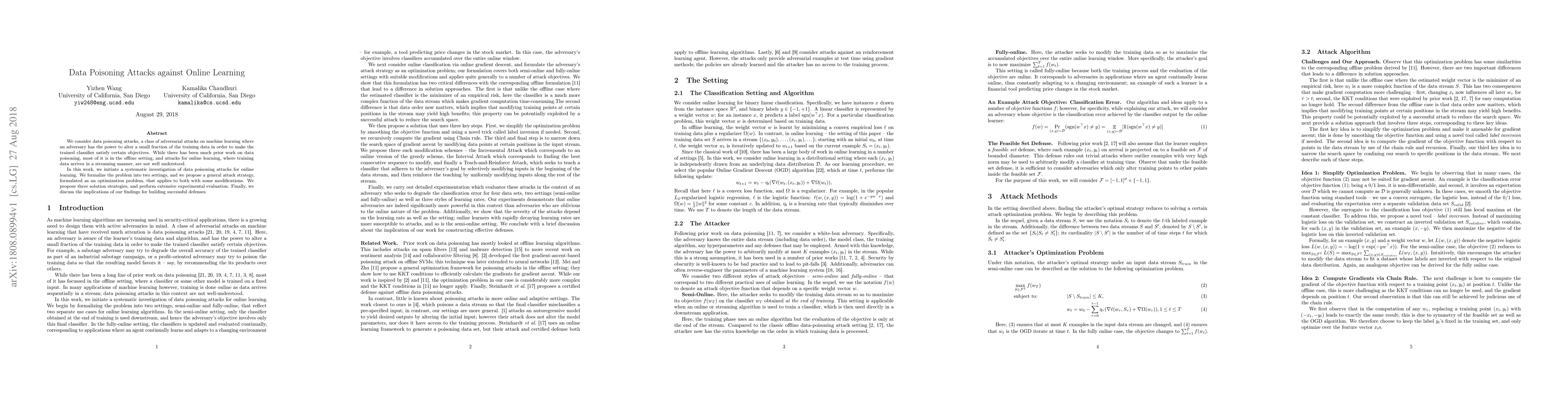This paper investigates data poisoning attacks in online learning, where adversaries manipulate a small fraction of streaming training data to influence model behavior. The authors propose a general attack strategy and three solution strategies, followed by extensive experiments, and discuss implications for defense mechanisms.