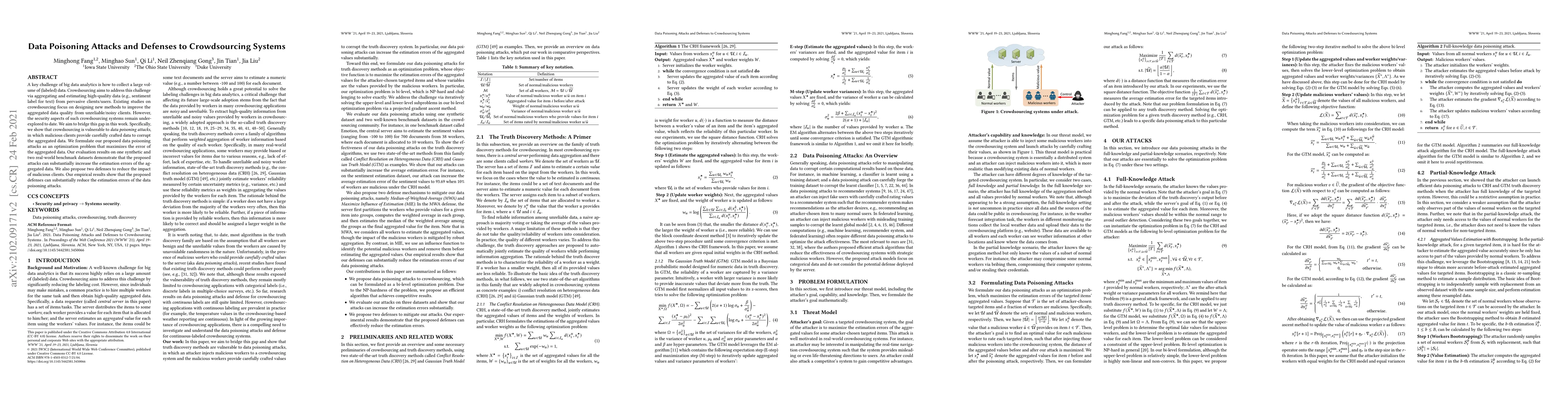 This paper investigates the vulnerability of crowdsourcing systems to data poisoning attacks, where malicious clients corrupt aggregated data. It proposes an optimization-based attack model and demonstrates its effectiveness on synthetic and real datasets, followed by the introduction of two defense mechanisms that significantly reduce the attack impact.