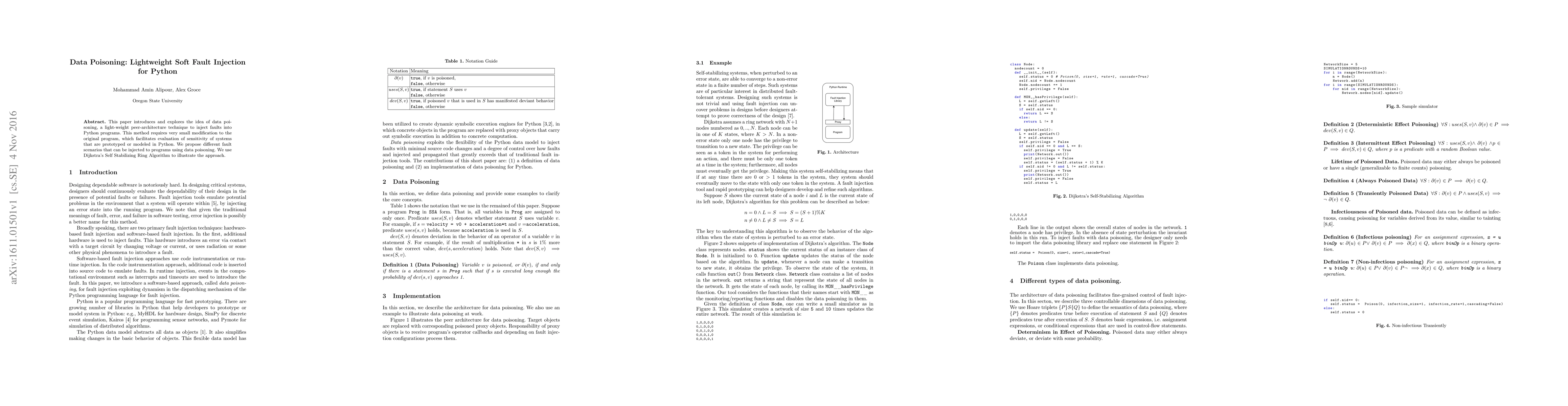 This paper introduces and explores the idea of data poisoning, a light-weight peer-architecture technique to inject faults into Python programs. This method requires very small modification to the original program, which facilitates evaluation of sensitivity of systems that are prototyped or modeled in Python. We propose different fault scenarios that can be injected to programs using data poisoning. We use Dijkstra's Self Stabilizing Ring Algorithm to illustrate the approach.