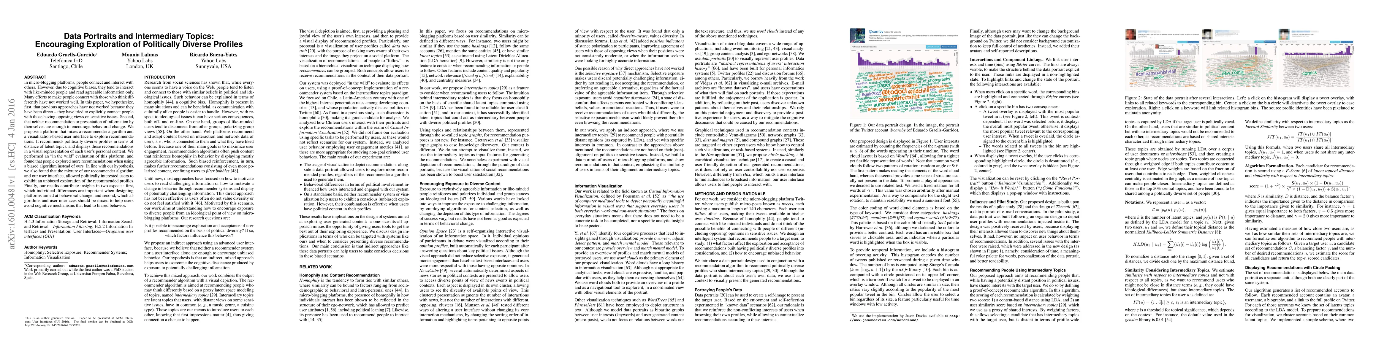This paper proposes a platform combining a recommender algorithm and visualization to encourage politically diverse interactions on micro-blogging platforms. The study found that users explored more diverse profiles when recommendations were visually integrated rather than directly presented, suggesting a more nuanced approach is needed to overcome cognitive biases.