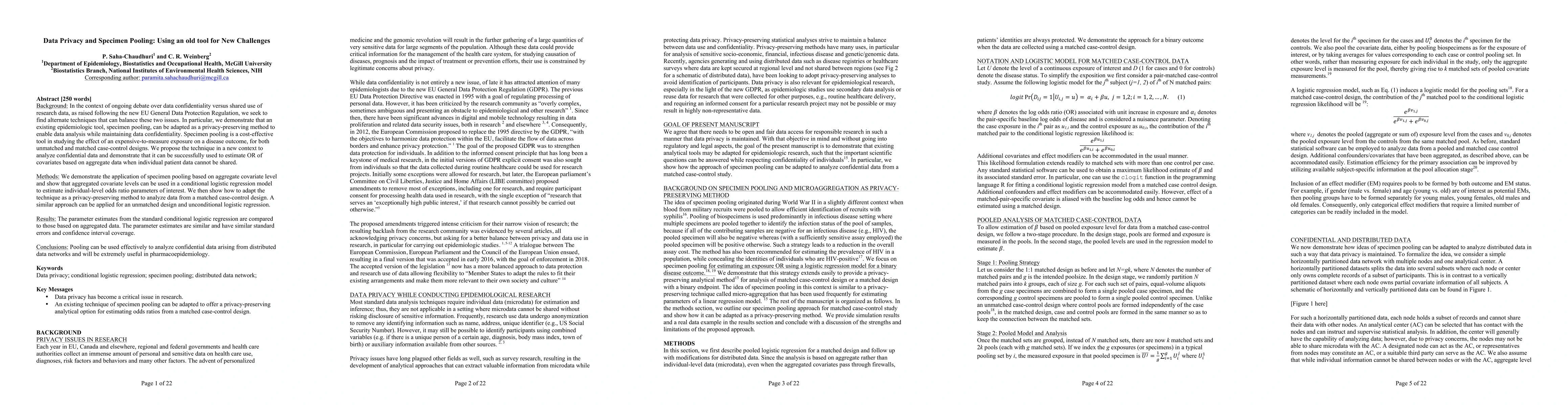 Background: In the context of ongoing debate over data confidentiality versus shared use of research data, as raised following the new EU General Data Protection Regulation, we seek to find alternate techniques that can balance these two issues. In particular, we demonstrate that an existing epidemiologic tool, specimen pooling, can be adapted as a privacy-preserving method to enable data analysis while maintaining data confidentiality. Specimen pooling is a cost-effective tool in studying the effect of an expensive-to-measure exposure on a disease outcome, for both unmatched and matched case-control designs. We propose the technique in a new context to analyze confidential data and demonstrate that it can be successfully used to estimate OR of covariates based on aggregate data when individual patient data cannot be shared. Methods: We demonstrate the application of specimen pooling based on aggregate covariate level and show that aggregated covariate levels can be used in a conditional logistic regression model to estimate individual-level odds ratio parameters of interest. We then show how to adapt the technique as a privacy-preserving method to analyze data from a matched case-control design. A similar approach can be applied for an unmatched design and unconditional logistic regression. Results: The parameter estimates from the standard conditional logistic regression are compared to those based on aggregated data. The parameter estimates are similar and have similar standard errors and confidence interval coverage. Conclusions: Pooling can be used effectively to analyze confidential data arising from distributed data networks and will be extremely useful in pharmacoepidemiology.