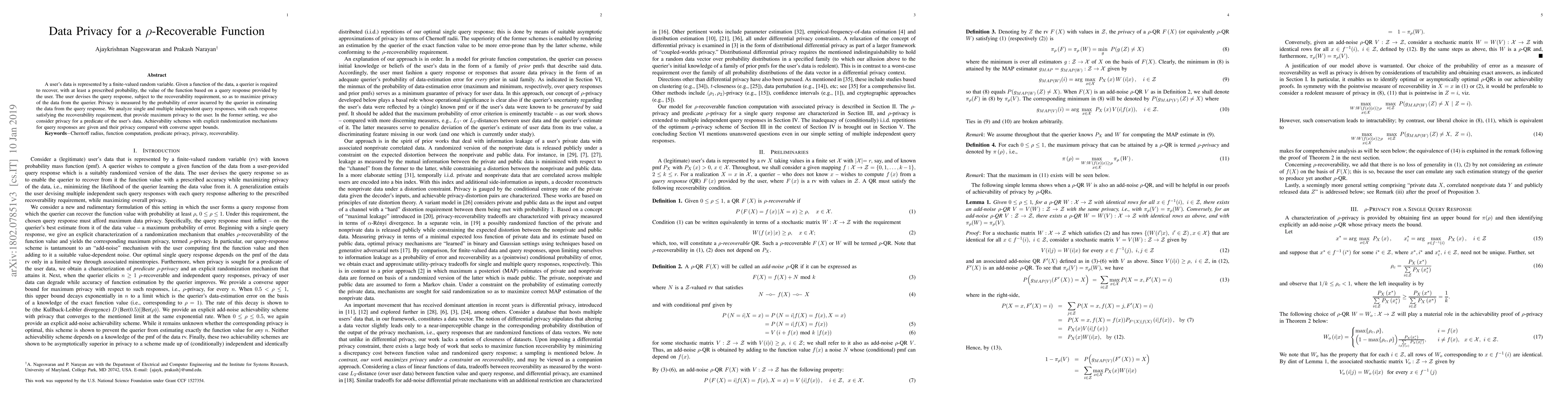 A user's data is represented by a finite-valued random variable. Given a function of the data, a querier is required to recover, with at least a prescribed probability, the value of the function based on a query response provided by the user. The user devises the query response, subject to the recoverability requirement, so as to maximize privacy of the data from the querier. Privacy is measured by the probability of error incurred by the querier in estimating the data from the query response. We analyze single and multiple independent query responses, with each response satisfying the recoverability requirement, that provide maximum privacy to the user. In the former setting, we also consider privacy for a predicate of the user's data. Achievability schemes with explicit randomization mechanisms for query responses are given and their privacy compared with converse upper bounds.