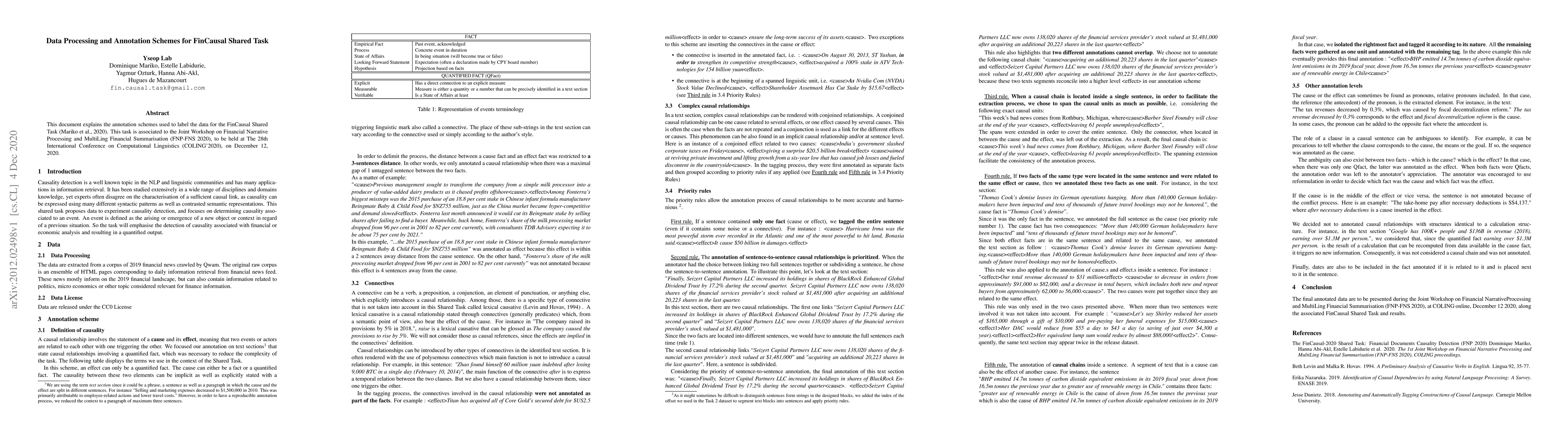 This document explains the annotation schemes used to label the data for the FinCausal Shared Task (Mariko et al., 2020). This task is associated to the Joint Workshop on Financial Narrative Processing and MultiLing Financial Summarisation (FNP-FNS 2020), to be held at The 28th International Conference on Computational Linguistics (COLING'2020), on December 12, 2020.