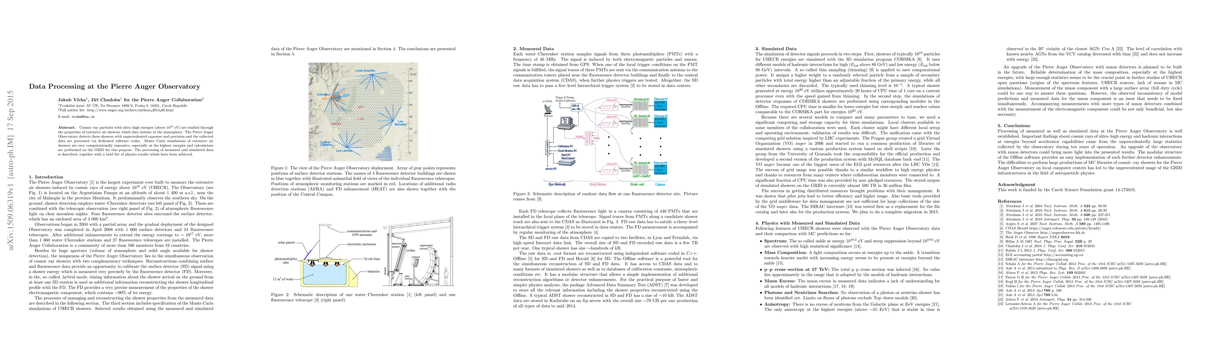 The Pierre Auger Observatory studies ultra-high-energy cosmic rays by detecting extensive air showers with high precision and exposure, processing the data using specialized software, and utilizing computational grids for expensive simulations. Key physics results have been derived from both measured and simulated data.