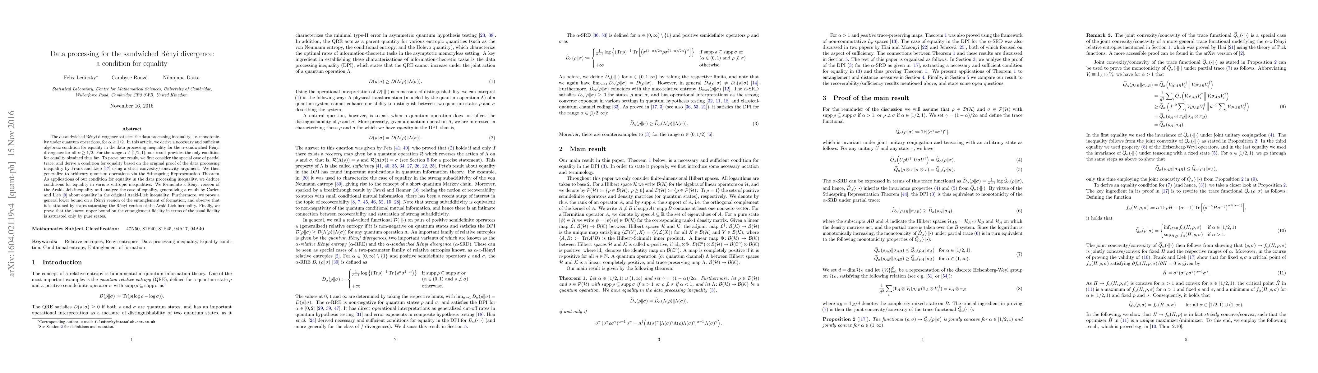 The $\alpha$-sandwiched R\'enyi divergence satisfies the data processing inequality, i.e. monotonicity under quantum operations, for $\alpha\geq 1/2$. In this article, we derive a necessary and sufficient algebraic condition for equality in the data processing inequality for the $\alpha$-sandwiched R\'enyi divergence for all $\alpha\geq 1/2$. For the range $\alpha\in [1/2,1)$, our result provides the only condition for equality obtained thus far. To prove our result, we first consider the special case of partial trace, and derive a condition for equality based on the original proof of the data processing inequality by Frank and Lieb [J. Math. Phys. 54.12 (2013), p. 122201] using a strict convexity/concavity argument. We then generalize to arbitrary quantum operations via the Stinespring Representation Theorem. As applications of our condition for equality in the data processing inequality, we deduce conditions for equality in various entropic inequalities. We formulate a R\'enyi version of the Araki-Lieb inequality and analyze the case of equality, generalizing a result by Carlen and Lieb [Lett. Math. Phys. 101.1 (2012), pp. 1-11] about equality in the original Araki-Lieb inequality. Furthermore, we prove a general lower bound on a R\'enyi version of the entanglement of formation, and observe that it is attained by states saturating the R\'enyi version of the Araki-Lieb inequality. Finally, we prove that the known upper bound on the entanglement fidelity in terms of the usual fidelity is saturated only by pure states.