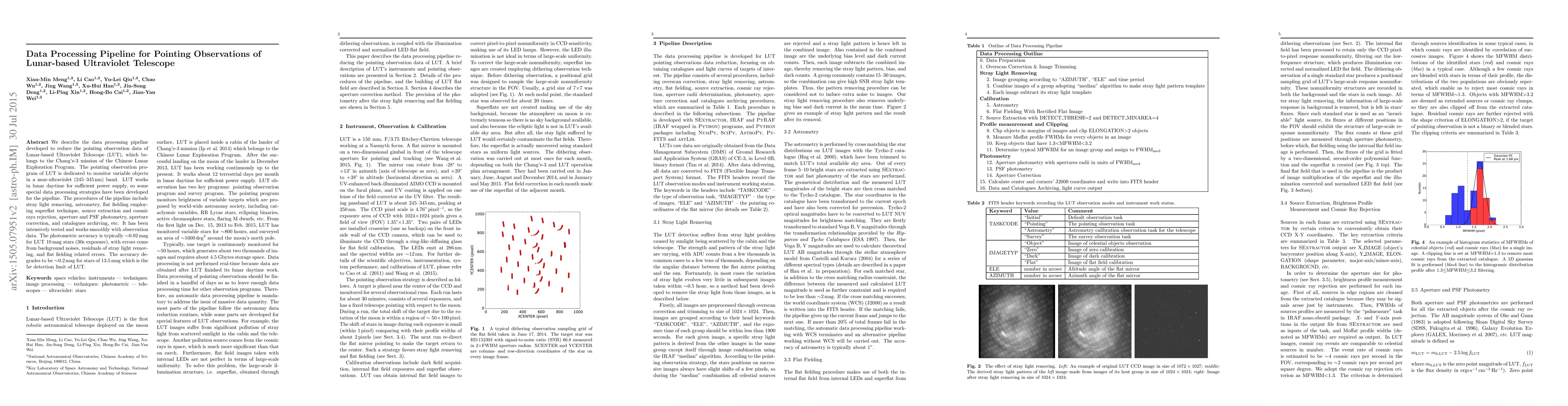 This paper details a data processing pipeline for the Lunar-based Ultraviolet Telescope (LUT) on the Chang'e-3 mission, focusing on reducing pointing observation data. The pipeline includes steps like stray light removal, astrometry, and PSF photometry, achieving photometric accuracy of ~0.02 mag for bright stars and ~0.2 mag for fainter ones.