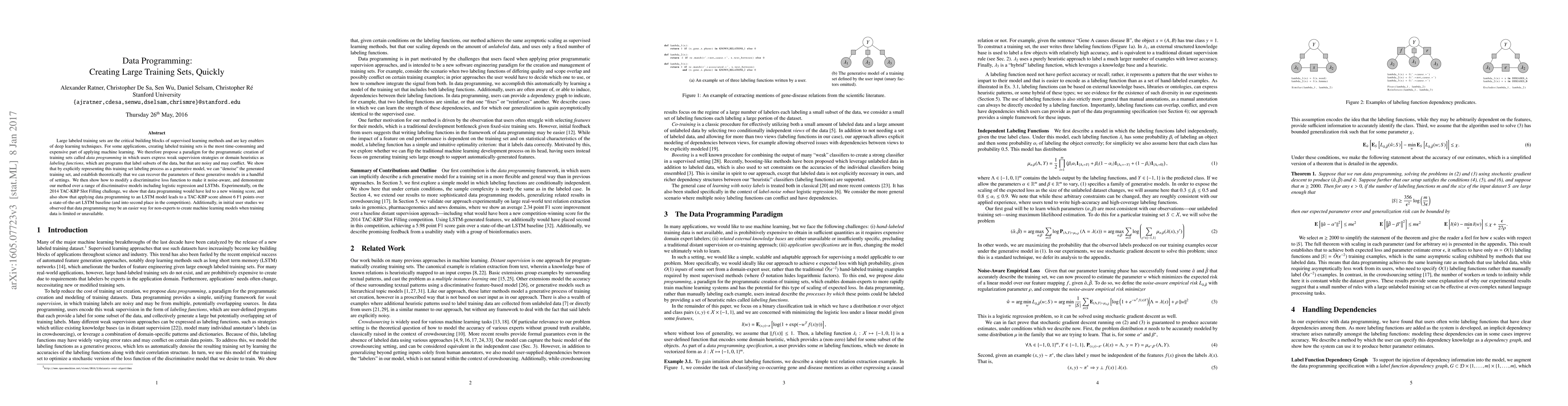 This paper proposes data programming to quickly create large training sets by using noisy labeling functions, which are heuristics expressed as programs. The method denoises the generated training sets and adapts discriminative loss functions to be noise-aware, demonstrating improved performance on the 2014 TAC-KBP Slot Filling challenge and suggesting that data programming can simplify model creation for non-experts.