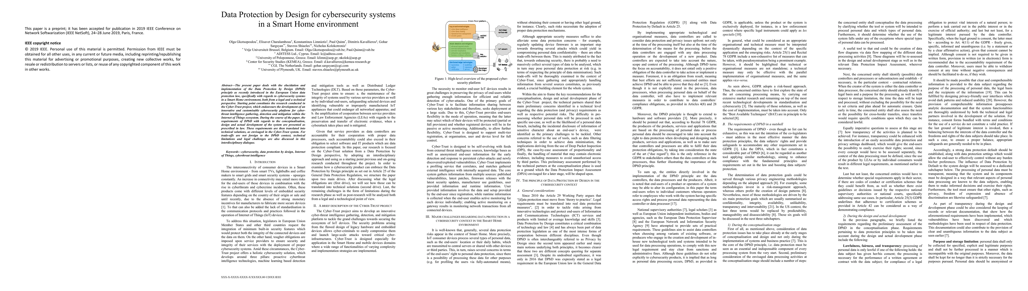 This paper explores the implementation of the Data Protection by Design principle in cybersecurity systems for smart homes, integrating legal requirements from EU data protection law with technical solutions developed in the Cyber-Trust project. It addresses both conceptual and practical challenges, balancing legal mandates with technical limitations.