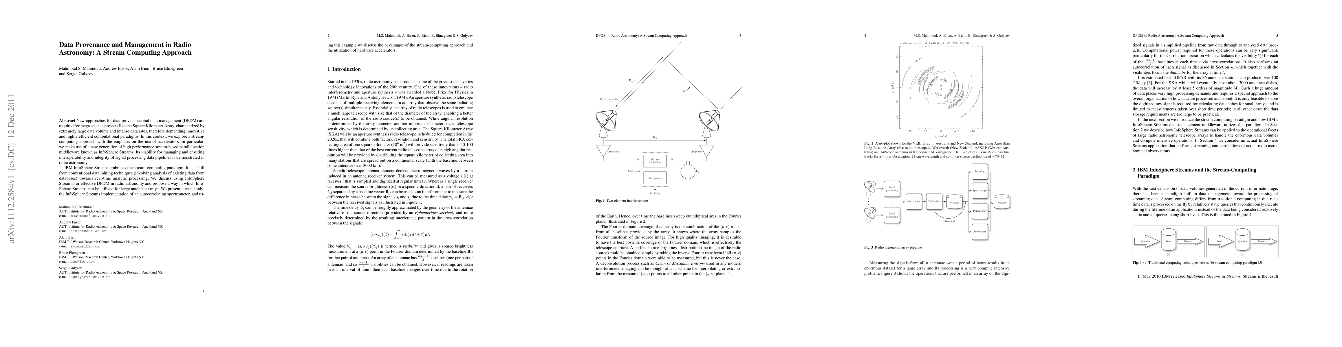 This paper explores a stream-computing approach using IBM InfoSphere Streams for data provenance and management in radio astronomy, emphasizing the use of hardware accelerators to handle the large data volumes and real-time processing demands of projects like the Square Kilometer Array. The study demonstrates InfoSphere Streams' effectiveness in managing data pipelines and presents a case-study of its implementation in an autocorrelating spectrometer.