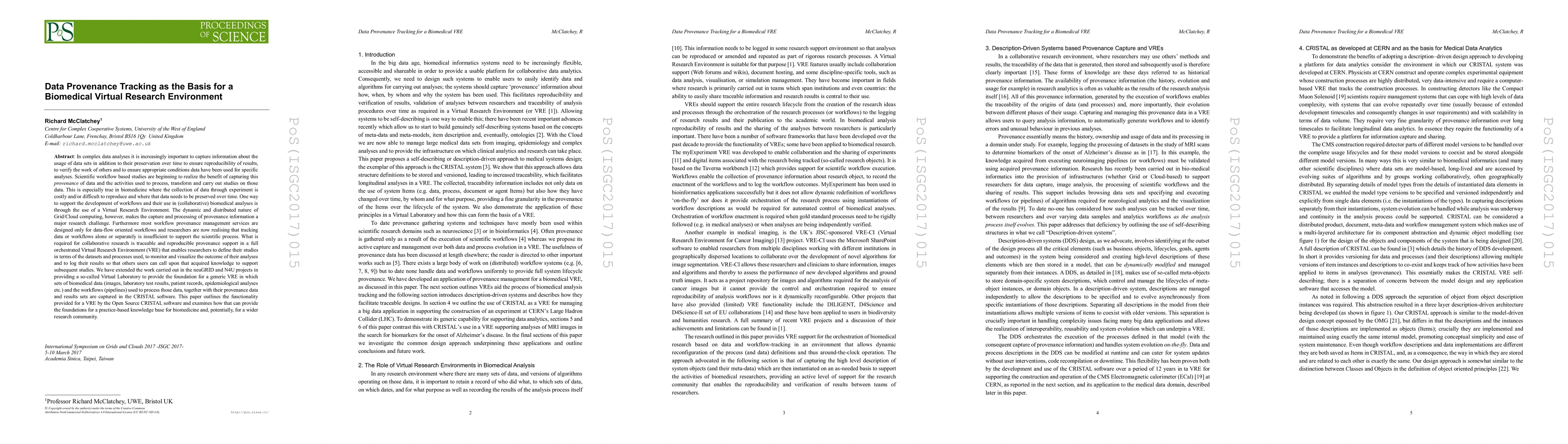 In complex data analyses it is increasingly important to capture information about the usage of data sets in addition to their preservation over time to ensure reproducibility of results, to verify the work of others and to ensure appropriate conditions data have been used for specific analyses. Scientific workflow based studies are beginning to realize the benefit of capturing this provenance of data and the activities used to process, transform and carry out studies on those data. One way to support the development of workflows and their use in (collaborative) biomedical analyses is through the use of a Virtual Research Environment. The dynamic and distributed nature of Grid/Cloud computing, however, makes the capture and processing of provenance information a major research challenge. Furthermore most workflow provenance management services are designed only for data-flow oriented workflows and researchers are now realising that tracking data or workflows alone or separately is insufficient to support the scientific process. What is required for collaborative research is traceable and reproducible provenance support in a full orchestrated Virtual Research Environment (VRE) that enables researchers to define their studies in terms of the datasets and processes used, to monitor and visualize the outcome of their analyses and to log their results so that others users can call upon that acquired knowledge to support subsequent studies. We have extended the work carried out in the neuGRID and N4U projects in providing a so-called Virtual Laboratory to provide the foundation for a generic VRE in which sets of biomedical data (images, laboratory test results, patient records, epidemiological analyses etc.) and the workflows (pipelines) used to process those data, together with their provenance data and results sets are captured in the CRISTAL software.