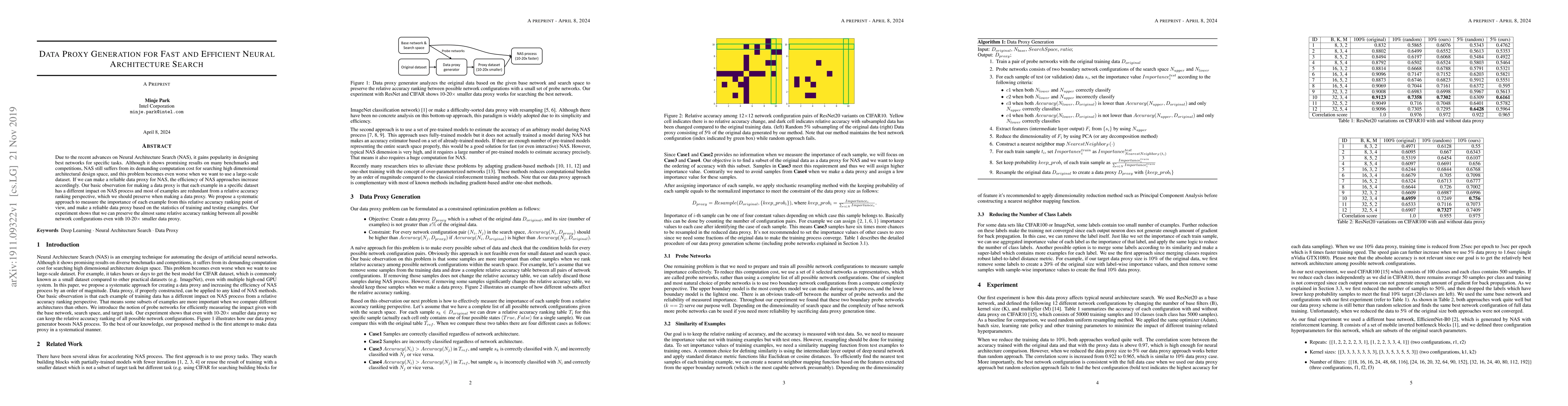 This paper proposes a method for generating a data proxy to enhance the efficiency of Neural Architecture Search (NAS) by reducing computational costs. The approach measures the importance of each dataset example based on relative accuracy ranking, creating a smaller but representative data proxy that maintains the relative accuracy between network configurations.