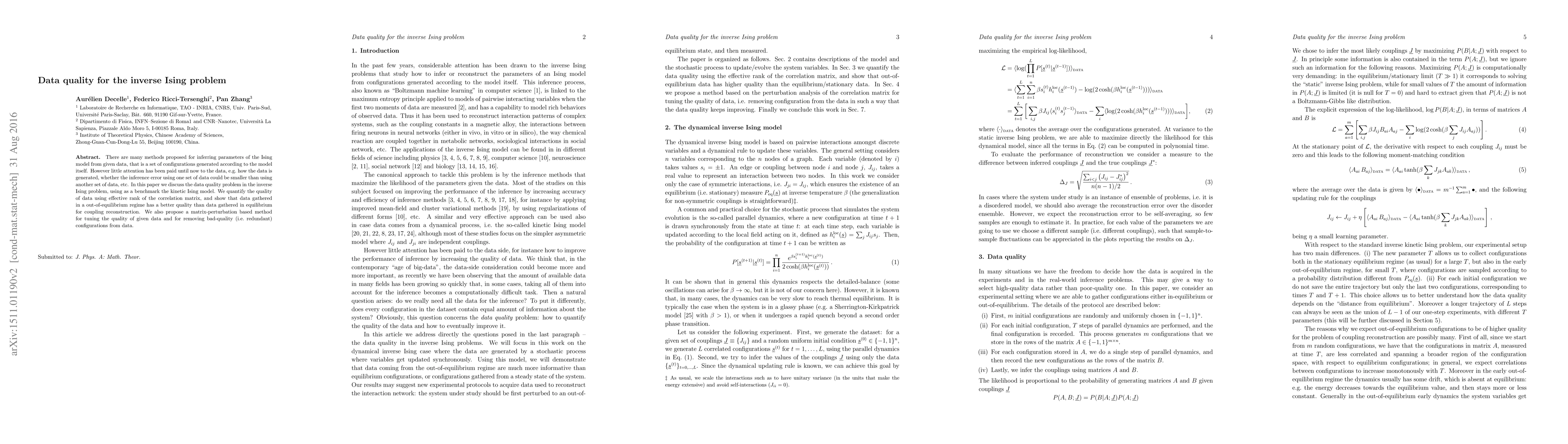 This paper investigates the quality of data used in the inverse Ising problem, proposing that data generated out of equilibrium has better quality for coupling reconstruction. The authors quantify data quality via the effective rank of the correlation matrix and introduce a matrix-perturbation method to enhance data quality and remove redundant configurations.