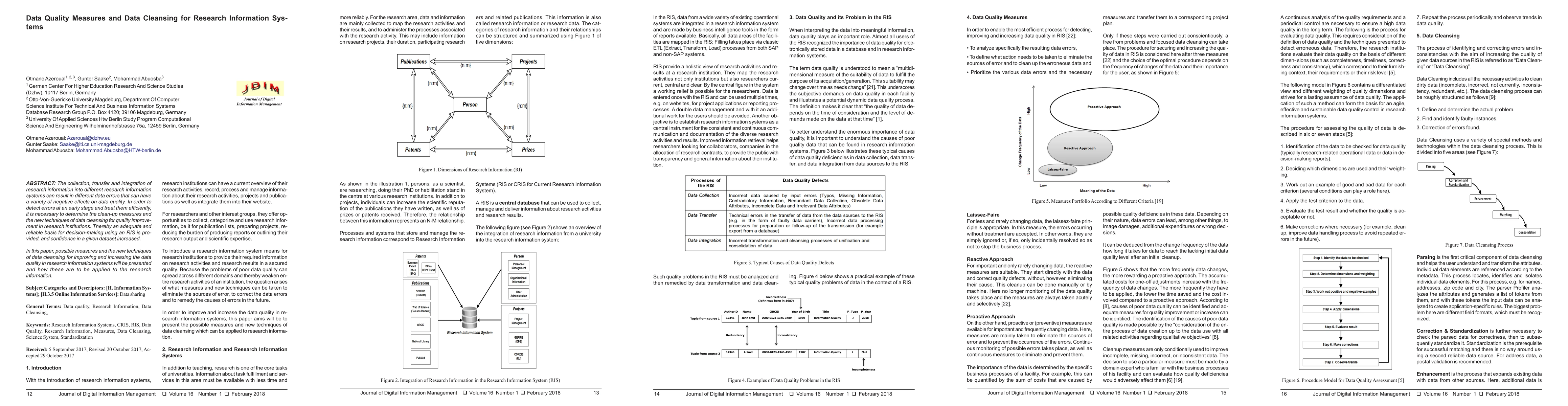 The collection, transfer and integration of research information into different research Information systems can result in different data errors that can have a variety of negative effects on data quality. In order to detect errors at an early stage and treat them efficiently, it is necessary to determine the clean-up measures and the new techniques of data cleansing for quality improvement in research institutions. Thereby an adequate and reliable basis for decision-making using an RIS is provided, and confidence in a given dataset increased. In this paper, possible measures and the new techniques of data cleansing for improving and increasing the data quality in research information systems will be presented and how these are to be applied to the Research information.