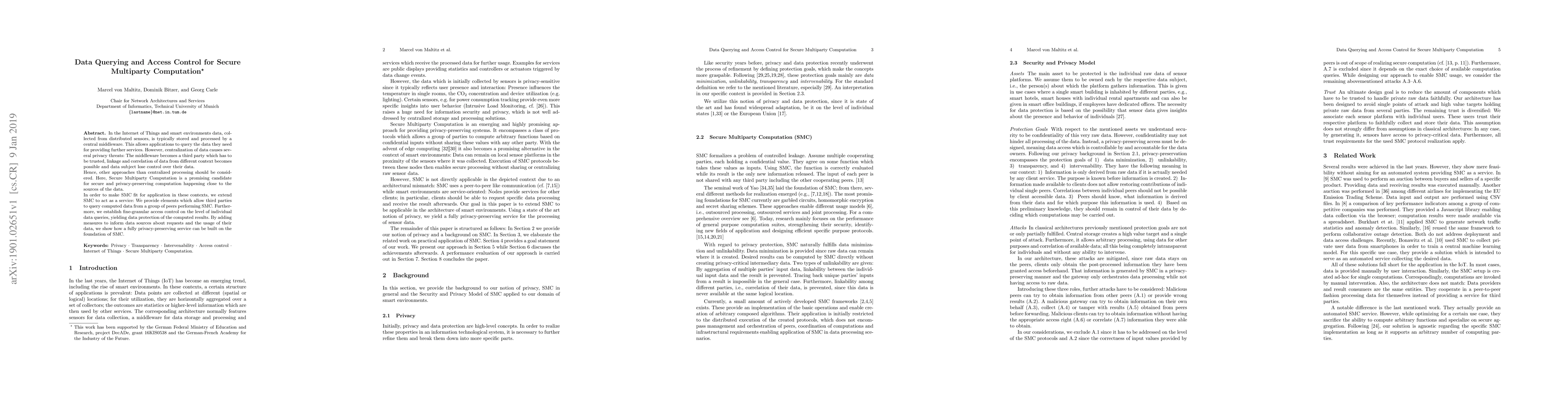 This paper explores Secure Multiparty Computation (SMC) as a privacy-preserving alternative to centralized data processing in IoT environments. It introduces mechanisms for third-party querying and fine-grained access control to ensure secure data access and protection while maintaining data privacy.