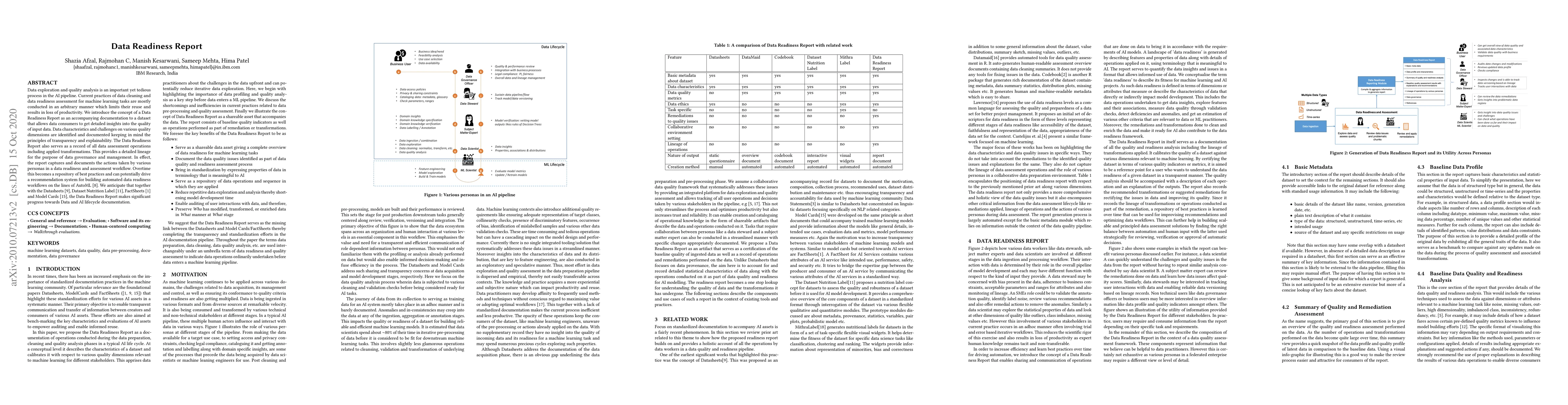 The paper introduces the Data Readiness Report, a documentation tool accompanying datasets to provide transparent insights into data quality and readiness for machine learning tasks, aiming to improve reuse and productivity by capturing data assessment operations and transformations. This report serves as a repository of best practices and could support automated data readiness workflows.