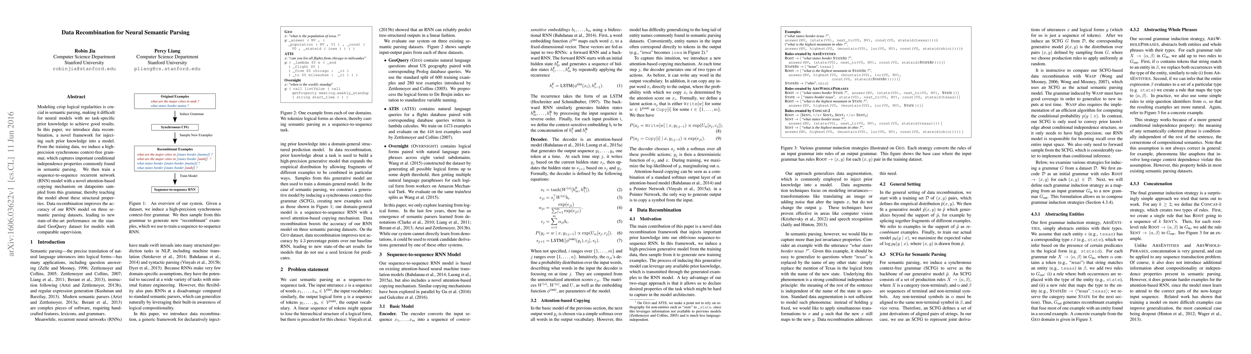 This paper proposes data recombination, a framework that enhances neural semantic parsing by incorporating task-specific prior knowledge through a high-precision grammar induced from training data. The method trains an RNN model with an attention-based copying mechanism on grammar-sampled datapoints, achieving state-of-the-art results on the GeoQuery dataset.