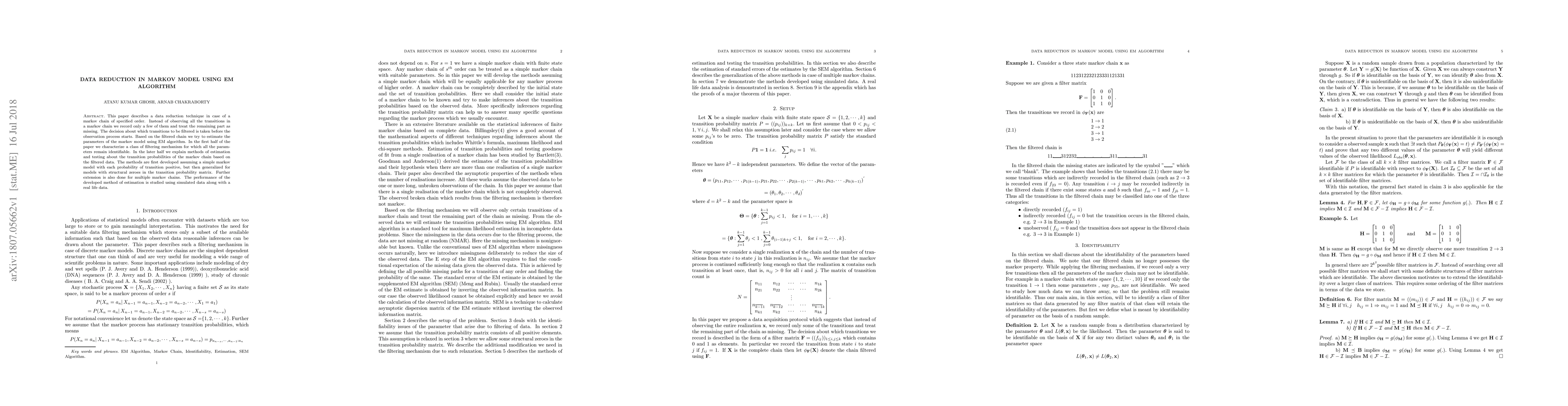 This paper introduces a data reduction method for Markov chains of specified order, retaining only selected transitions and treating others as missing data. The filtering mechanism ensures parameter identifiability, with estimation and testing methods for transition probabilities developed using the EM algorithm. The approach is initially applied to positive transition probability models, then extended to models with structural zeroes and multiple chains. The method's performance is validated through simulations and real-life data.