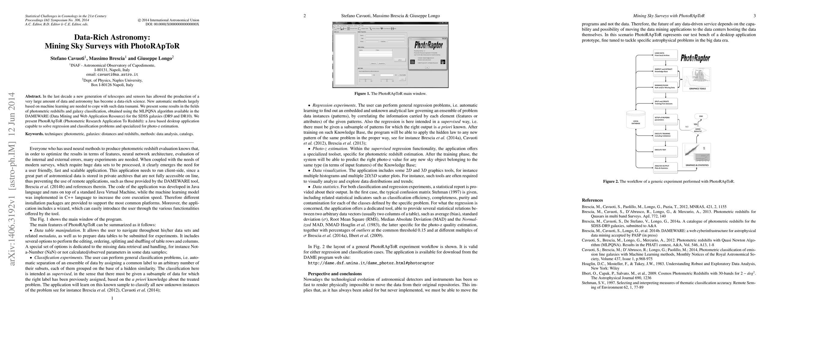 In the last decade a new generation of telescopes and sensors has allowed the production of a very large amount of data and astronomy has become a data-rich science. New automatic methods largely based on machine learning are needed to cope with such data tsunami. We present some results in the fields of photometric redshifts and galaxy classification, obtained using the MLPQNA algorithm available in the DAMEWARE (Data Mining and Web Application Resource) for the SDSS galaxies (DR9 and DR10). We present PhotoRApToR (Photometric Research Application To Redshift): a Java based desktop application capable to solve regression and classification problems and specialized for photo-z estimation.