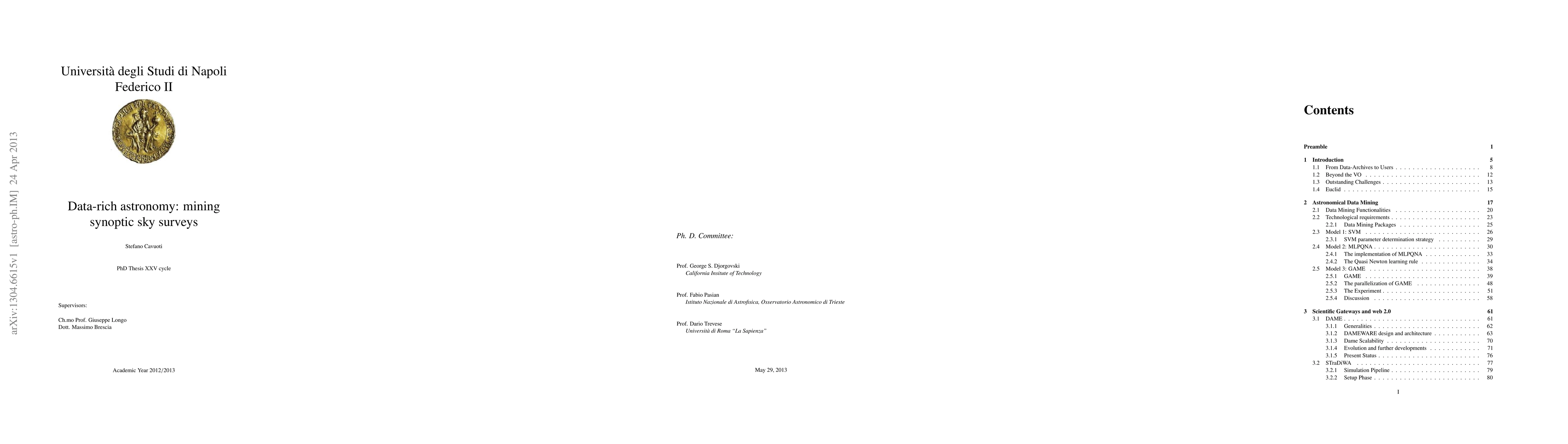 In the last decade a new generation of telescopes and sensors has allowed the production of a very large amount of data and astronomy has become, a data-rich science; this transition is often labeled as: "data revolution" and "data tsunami". The first locution puts emphasis on the expectations of the astronomers while the second stresses, instead, the dramatic problem arising from this large amount of data: which is no longer computable with traditional approaches to data storage, data reduction and data analysis. In a new, age new instruments are necessary, as it happened in the Bronze age when mankind left the old instruments made out of stone to adopt the new, better ones made with bronze. Everything changed, even the social structure. In a similar way, this new age of Astronomy calls for a new generation of tools and, for a new methodological approach to many problems, and for the acquisition of new skills. The attems to find a solution to this problems falls under the umbrella of a new discipline which originated by the intersection of astronomy, statistics and computer science: Astroinformatics, (Borne, 2009; Djorgovski et al., 2006).