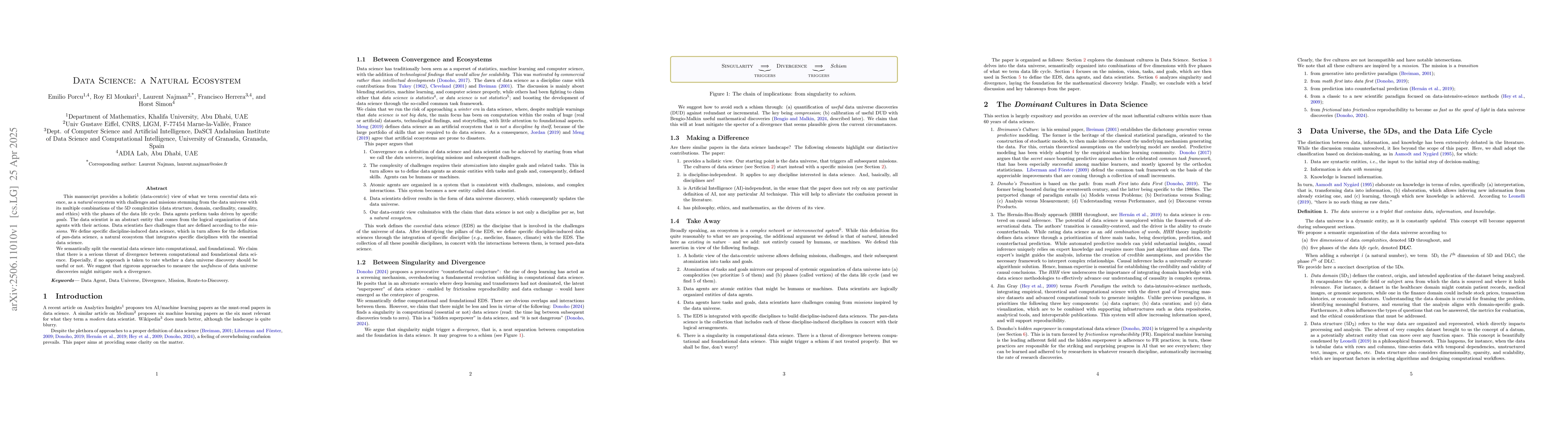 This manuscript provides a holistic (data-centric) view of what we term essential data science, as a natural ecosystem with challenges and missions stemming from the data universe with its multiple combinations of the 5D complexities (data structure, domain, cardinality, causality, and ethics) with the phases of the data life cycle. Data agents perform tasks driven by specific goals. The data scientist is an abstract entity that comes from the logical organization of data agents with their actions. Data scientists face challenges that are defined according to the missions. We define specific discipline-induced data science, which in turn allows for the definition of pan-data science, a natural ecosystem that integrates specific disciplines with the essential data science. We semantically split the essential data science into computational, and foundational. We claim that there is a serious threat of divergence between computational and foundational data science. Especially, if no approach is taken to rate whether a data universe discovery should be useful or not. We suggest that rigorous approaches to measure the usefulness of data universe discoveries might mitigate such a divergence.