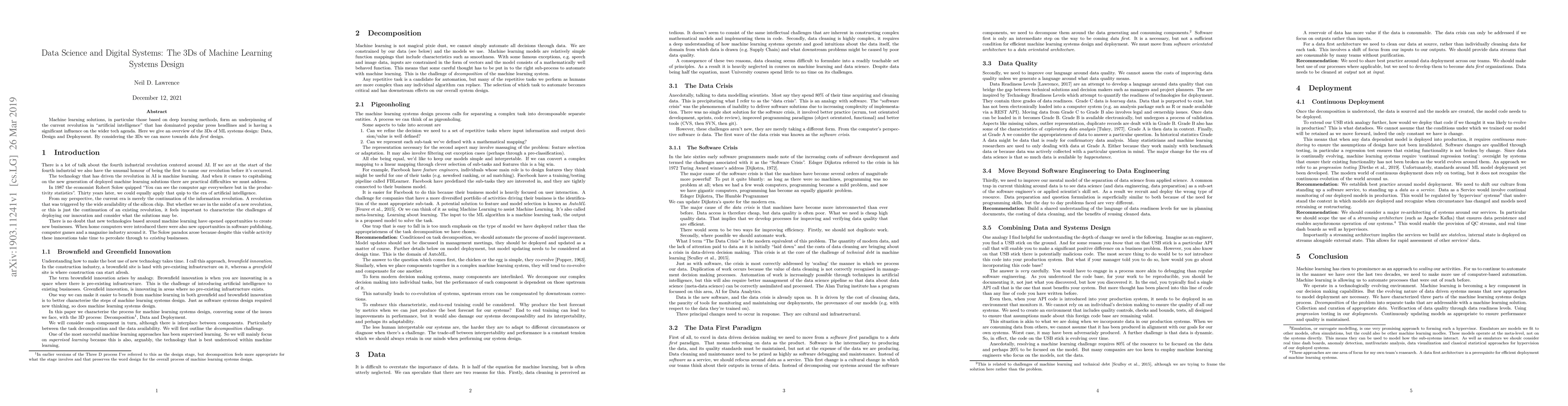 This paper explores the 3Ds of Machine Learning system design: Data, Design, and Deployment, aiming to move towards a data-first approach. It highlights the significance of machine learning in AI and its impact on tech agendas.