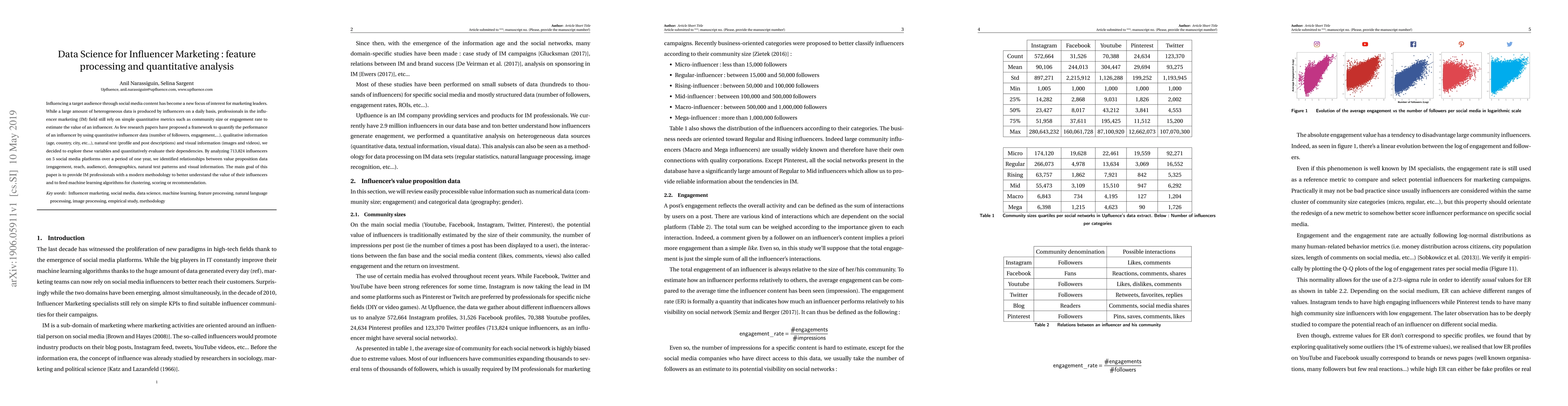 This paper explores the use of data science to quantify influencer marketing performance by analyzing various data types, including quantitative metrics, demographics, natural text, and visual information. It identifies relationships among these data types for 713,824 influencers across five social media platforms, aiming to provide a modern methodology for better influencer valuation and machine learning applications.
