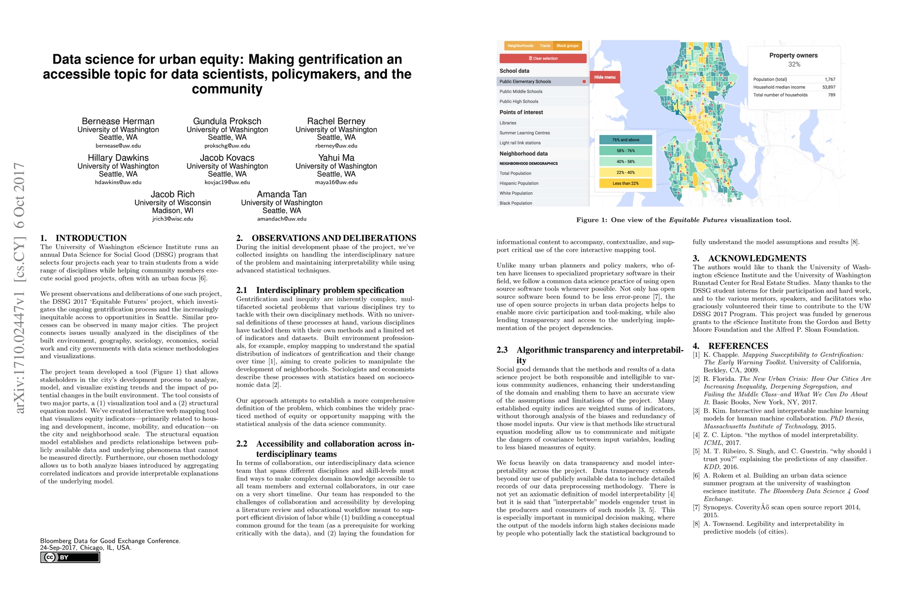 The University of Washington eScience Institute runs an annual Data Science for Social Good (DSSG) program that selects four projects each year to train students from a wide range of disciplines while helping community members execute social good projects, often with an urban focus. We present observations and deliberations of one such project, the DSSG 2017 'Equitable Futures' project, which investigates the ongoing gentrification process and the increasingly inequitable access to opportunities in Seattle. Similar processes can be observed in many major cities. The project connects issues usually analyzed in the disciplines of the built environment, geography, sociology, economics, social work and city governments with data science methodologies and visualizations.