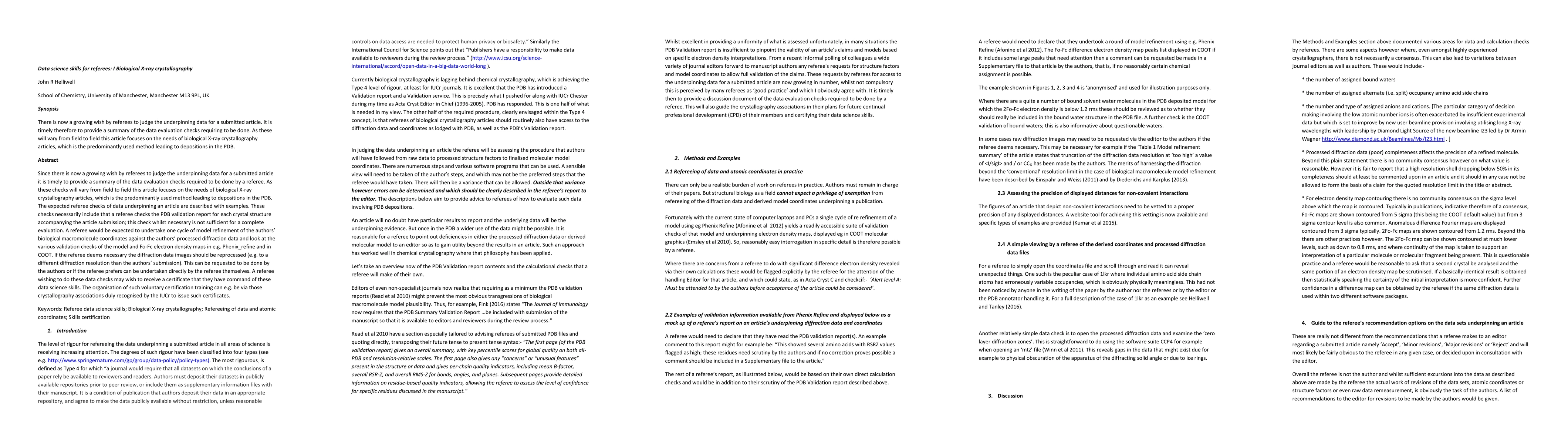Since there is now a growing wish by referees to judge the underpinning data for a submitted article it is timely to provide a summary of the data evaluation checks required to be done by a referee. As these checks will vary from field to field this article focuses on the needs of biological X-ray crystallography articles, which is the predominantly used method leading to depositions in the PDB. The expected referee checks of data underpinning an article are described with examples. These checks necessarily include that a referee checks the PDB validation report for each crystal structure accompanying the article submission; this check whilst necessary is not sufficient for a complete evaluation. A referee would be expected to undertake one cycle of model refinement of the authors biological macromolecule coordinates against the authors processed diffraction data and look at the various validation checks of the model and Fo-Fc electron density maps in e.g. Phenix_refine and in COOT. If the referee deems necessary the diffraction data images should be reprocessed (e.g. to a different diffraction resolution than the authors submission). This can be requested to be done by the authors or if the referee prefers can be undertaken directly by the referee themselves. A referee wishing to do these data checks may wish to receive a certificate that they have command of these data science skills. The organisation of such voluntary certification training can e.g. be via those crystallography associations duly recognised by the IUCr to issue such certificates.