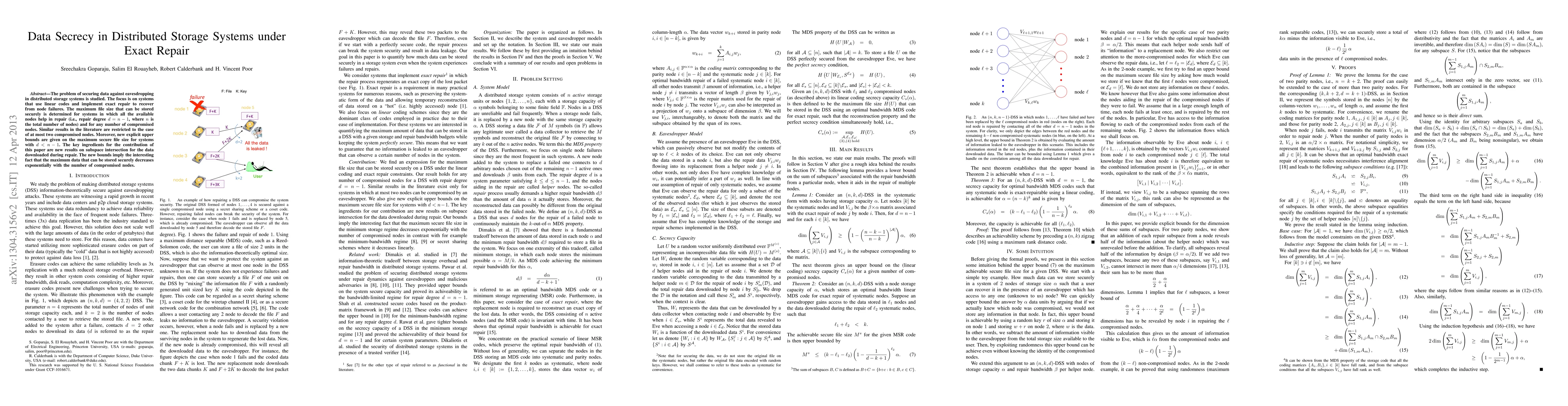 This paper investigates data secrecy in distributed storage systems using linear codes with exact repair, determining the maximum secure file size for systems where all nodes assist in repair and any number of nodes can be compromised. It provides new upper bounds on secure storage capacity, revealing that security decreases exponentially with the number of compromised nodes.