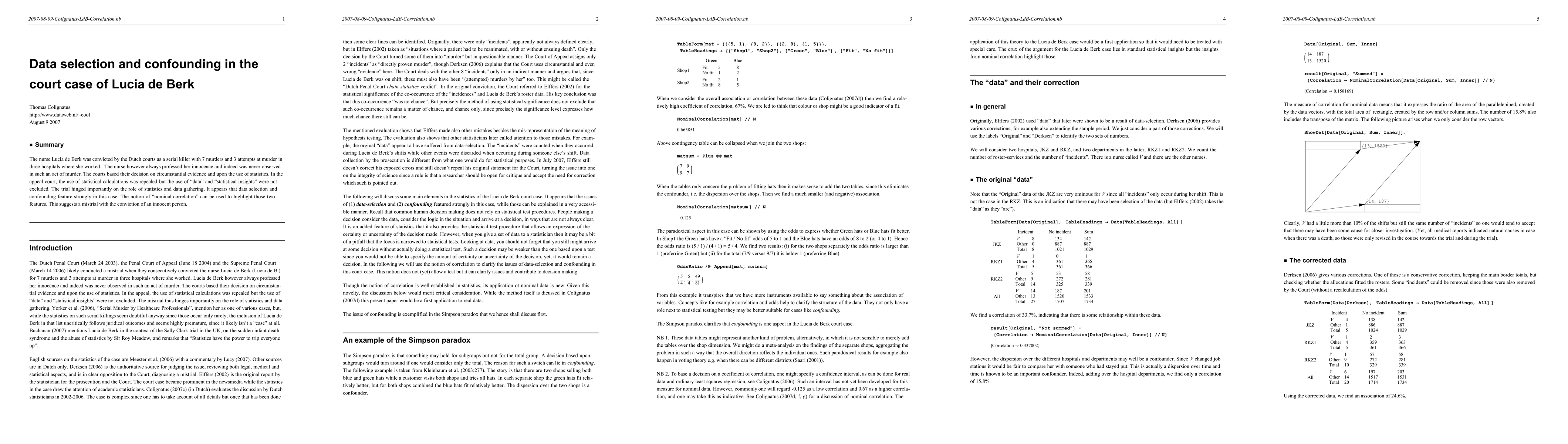 The nurse Lucia de Berk was convicted by the Dutch courts as a serial killer with 7 murders and 3 attempts at murder in three hospitals where she worked. The nurse however always professed her innocence and indeed was never observed in such an act of murder. The courts based their decision on circumstantial evidence and upon the use of statistics. In the appeal court, the use of statistical calculations was repealed but the use of "data" and "statistical insights" were not excluded. The trial hinged importantly on the role of statistics and data gathering. It appears that data selection and confounding feature strongly in this case. The notion of "nominal correlation" can be used to highlight those two features. This suggests a mistrial with the conviction of an innocent person.