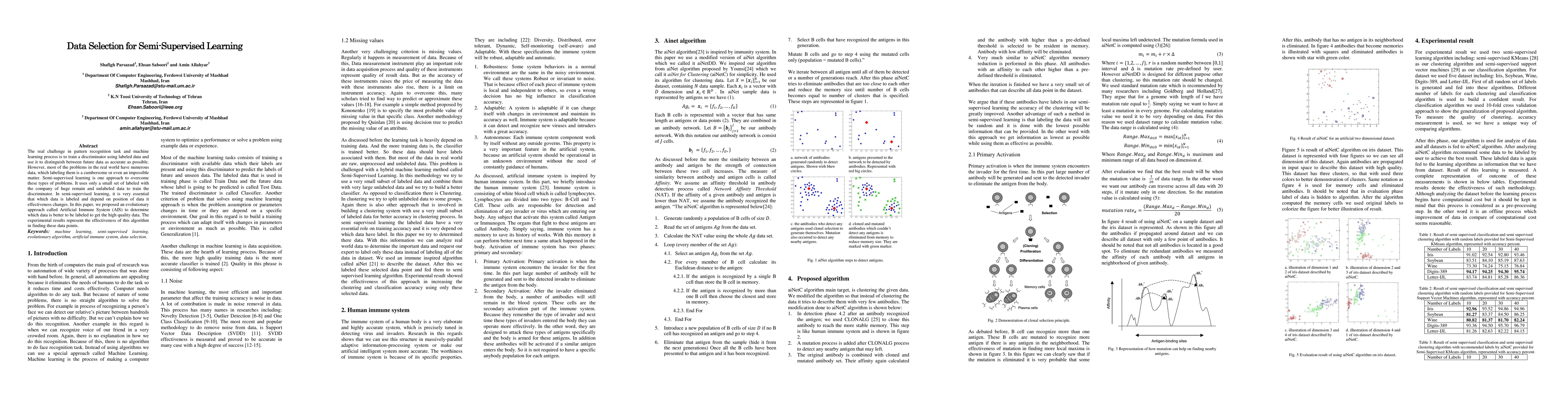The real challenge in pattern recognition task and machine learning process is to train a discriminator using labeled data and use it to distinguish between future data as accurate as possible. However, most of the problems in the real world have numerous data, which labeling them is a cumbersome or even an impossible matter. Semi-supervised learning is one approach to overcome these types of problems. It uses only a small set of labeled with the company of huge remain and unlabeled data to train the discriminator. In semi-supervised learning, it is very essential that which data is labeled and depend on position of data it effectiveness changes. In this paper, we proposed an evolutionary approach called Artificial Immune System (AIS) to determine which data is better to be labeled to get the high quality data. The experimental results represent the effectiveness of this algorithm in finding these data points.