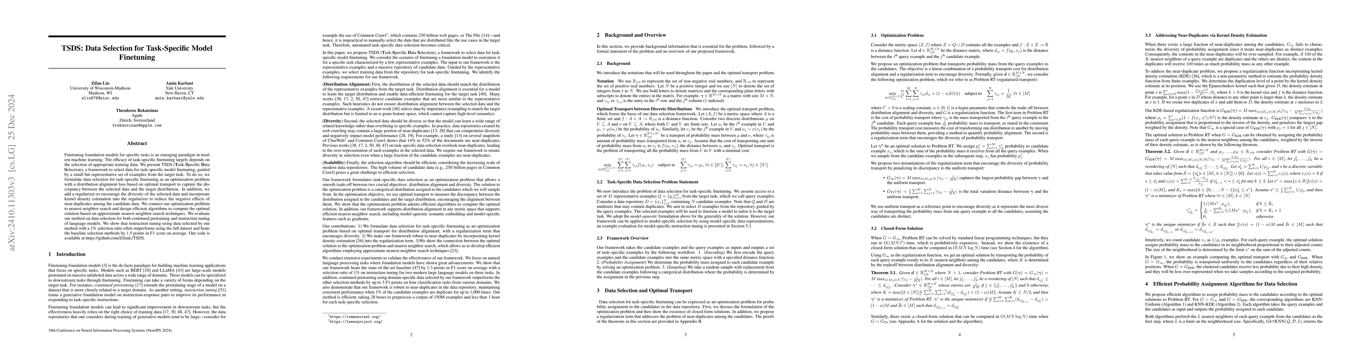 This paper proposes a framework for selecting optimal training data for finetuning machine learning models, employing an optimization approach with distribution alignment loss and a diversity regularizer to ensure representativeness and reduce near-duplicates. The method achieves superior performance in instruction tuning, often outperforming full dataset finetuning and baseline methods.