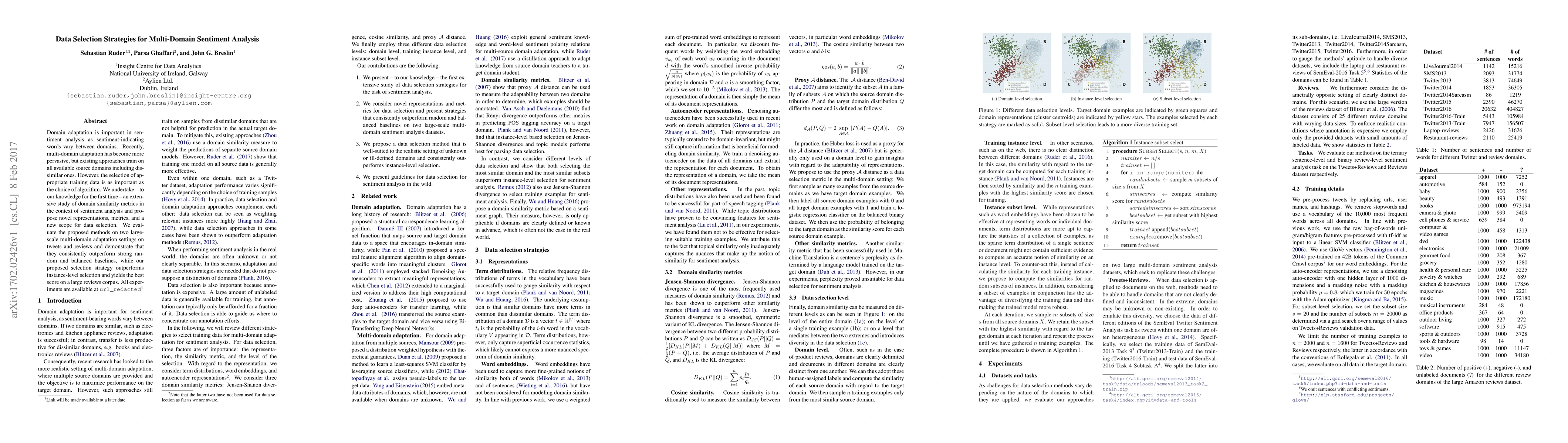 This paper explores data selection strategies for multi-domain sentiment analysis, proposing novel representations and metrics for domain similarity. The study demonstrates that the proposed selection strategy outperforms existing methods and achieves the best results in large-scale multi-domain adaptation settings.