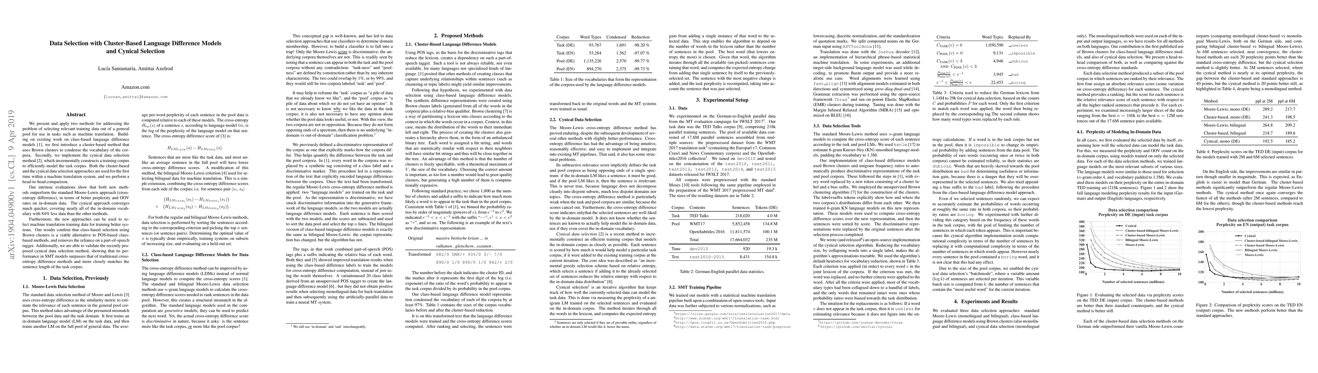 New methods for selecting relevant training data outperform traditional cross-entropy difference methods in machine translation, using cluster-based language difference models and a cynical approach that converges quickly with less data.