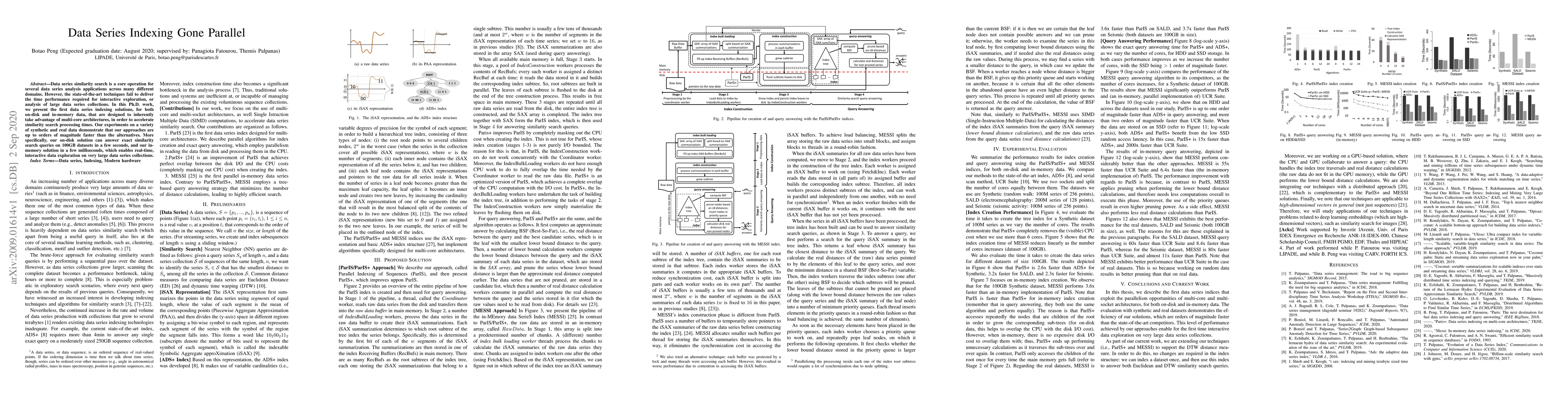 Data series similarity search is a core operation for several data series analysis applications across many different domains. However, the state-of-the-art techniques fail to deliver the time performance required for interactive exploration, or analysis of large data series collections. In this Ph.D. work, we present the first data series indexing solutions, for both on-disk and in-memory data, that are designed to inherently take advantage of multi-core architectures, in order to accelerate similarity search processing times. Our experiments on a variety of synthetic and real data demonstrate that our approaches are up to orders of magnitude faster than the alternatives. More specifically, our on-disk solution can answer exact similarity search queries on 100GB datasets in a few seconds, and our in-memory solution in a few milliseconds, which enables real-time, interactive data exploration on very large data series collections.