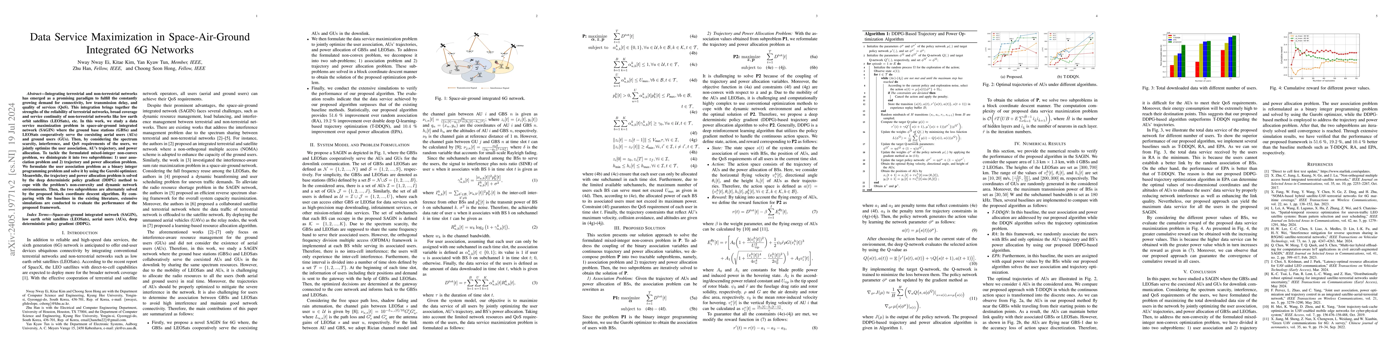 This paper investigates data service maximization in integrated terrestrial-non-terrestrial 6G networks, using deep reinforcement learning to optimize user association, aerial user trajectories, and power allocation. The approach employs a deep deterministic policy gradient method to handle the non-convexity and dynamic conditions, achieving improved connectivity and service quality.