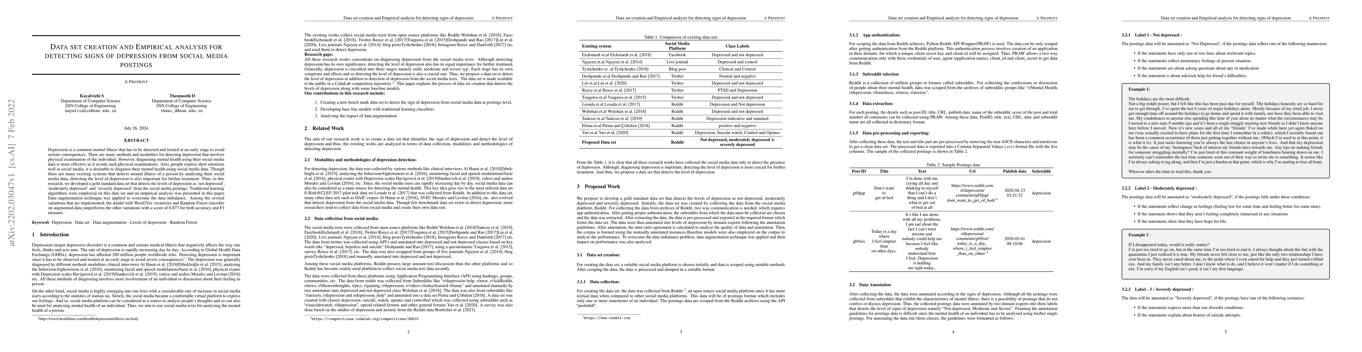 Depression is a common mental illness that has to be detected and treated at an early stage to avoid serious consequences. There are many methods and modalities for detecting depression that involves physical examination of the individual. However, diagnosing mental health using their social media data is more effective as it avoids such physical examinations. Also, people express their emotions well in social media, it is desirable to diagnose their mental health using social media data. Though there are many existing systems that detects mental illness of a person by analysing their social media data, detecting the level of depression is also important for further treatment. Thus, in this research, we developed a gold standard data set that detects the levels of depression as `not depressed', `moderately depressed' and `severely depressed' from the social media postings. Traditional learning algorithms were employed on this data set and an empirical analysis was presented in this paper. Data augmentation technique was applied to overcome the data imbalance. Among the several variations that are implemented, the model with Word2Vec vectorizer and Random Forest classifier on augmented data outperforms the other variations with a score of 0.877 for both accuracy and F1 measure.