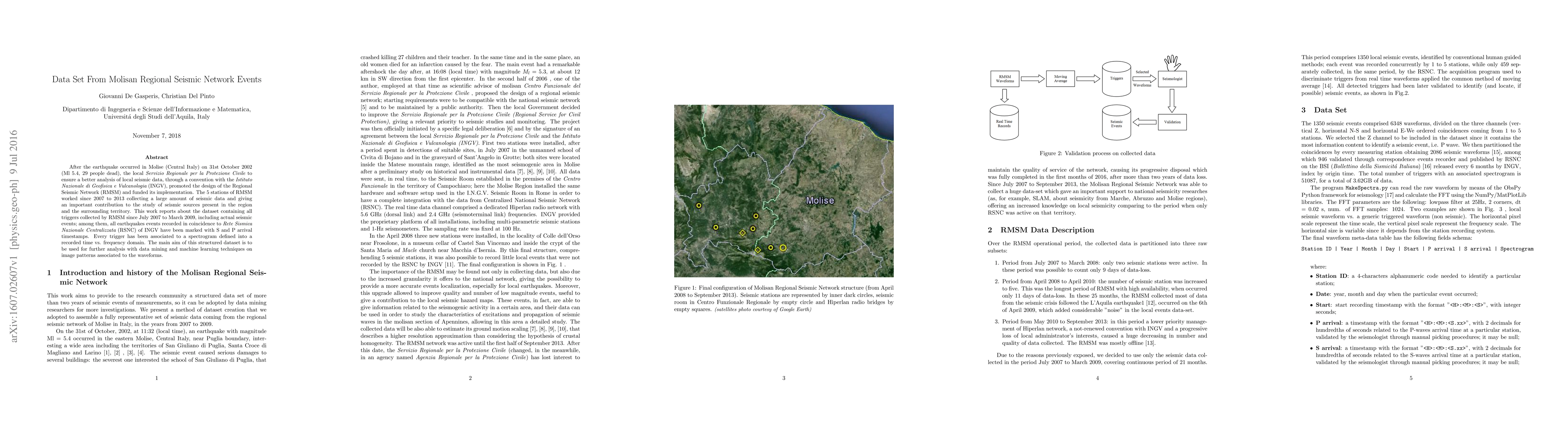After the earthquake occurred in Molise (Central Italy) on 31st October 2002 (Ml 5.4, 29 people dead), the local Servizio Regionale per la Protezione Civile to ensure a better analysis of local seismic data, through a convention with the Istituto Nazionale di Geofisica e Vulcanologia (INGV), promoted the design of the Regional Seismic Network (RMSM) and funded its implementation. The 5 stations of RMSM worked since 2007 to 2013 collecting a large amount of seismic data and giving an important contribution to the study of seismic sources present in the region and the surrounding territory. This work reports about the dataset containing all triggers collected by RMSM since July 2007 to March 2009, including actual seismic events; among them, all earthquakes events recorded in coincidence to Rete Sismica Nazionale Centralizzata (RSNC) of INGV have been marked with S and P arrival timestamps. Every trigger has been associated to a spectrogram defined into a recorded time vs. frequency domain. The main aim of this structured dataset is to be used for further analysis with data mining and machine learning techniques on image patterns associated to the waveforms.