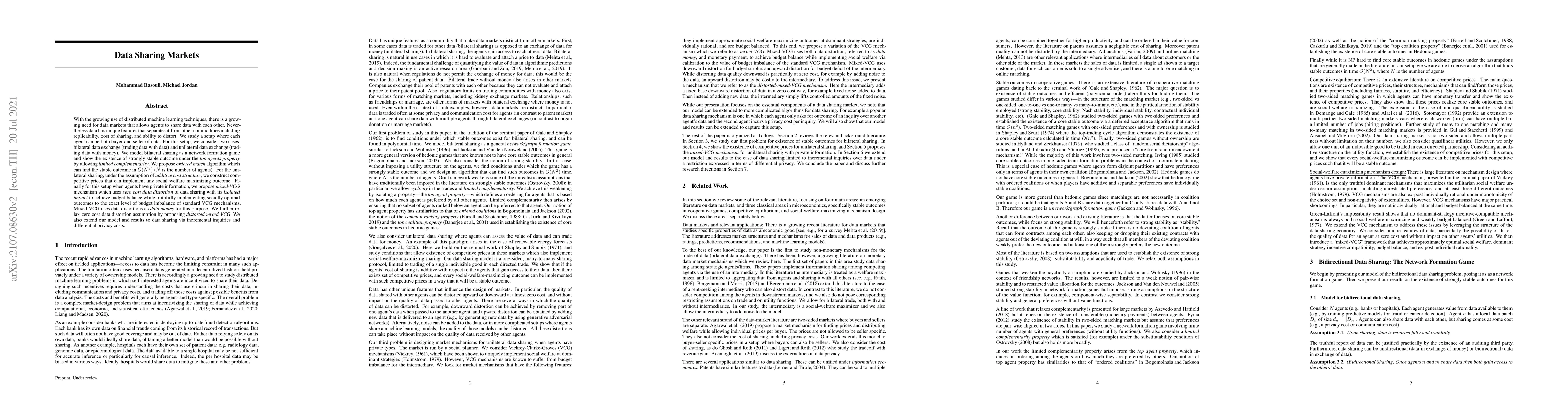 With the growing use of distributed machine learning techniques, there is a growing need for data markets that allows agents to share data with each other. Nevertheless data has unique features that separates it from other commodities including replicability, cost of sharing, and ability to distort. We study a setup where each agent can be both buyer and seller of data. For this setup, we consider two cases: bilateral data exchange (trading data with data) and unilateral data exchange (trading data with money). We model bilateral sharing as a network formation game and show the existence of strongly stable outcome under the top agents property by allowing limited complementarity. We propose ordered match algorithm which can find the stable outcome in O(N^2) (N is the number of agents). For the unilateral sharing, under the assumption of additive cost structure, we construct competitive prices that can implement any social welfare maximizing outcome. Finally for this setup when agents have private information, we propose mixed-VCG mechanism which uses zero cost data distortion of data sharing with its isolated impact to achieve budget balance while truthfully implementing socially optimal outcomes to the exact level of budget imbalance of standard VCG mechanisms. Mixed-VCG uses data distortions as data money for this purpose. We further relax zero cost data distortion assumption by proposing distorted-mixed-VCG. We also extend our model and results to data sharing via incremental inquiries and differential privacy costs.