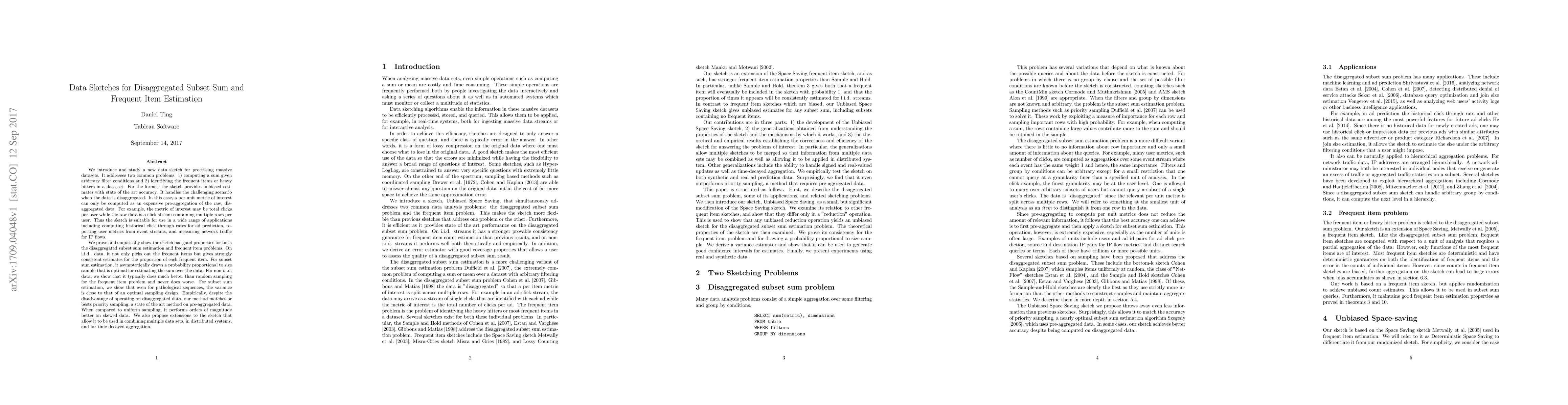 This paper introduces a new data sketch for efficiently processing massive datasets, addressing disaggregated subset sum estimation and frequent item identification. It provides unbiased estimates with state-of-the-art accuracy, especially for non-i.i.d. data, and outperforms existing methods on skewed data.