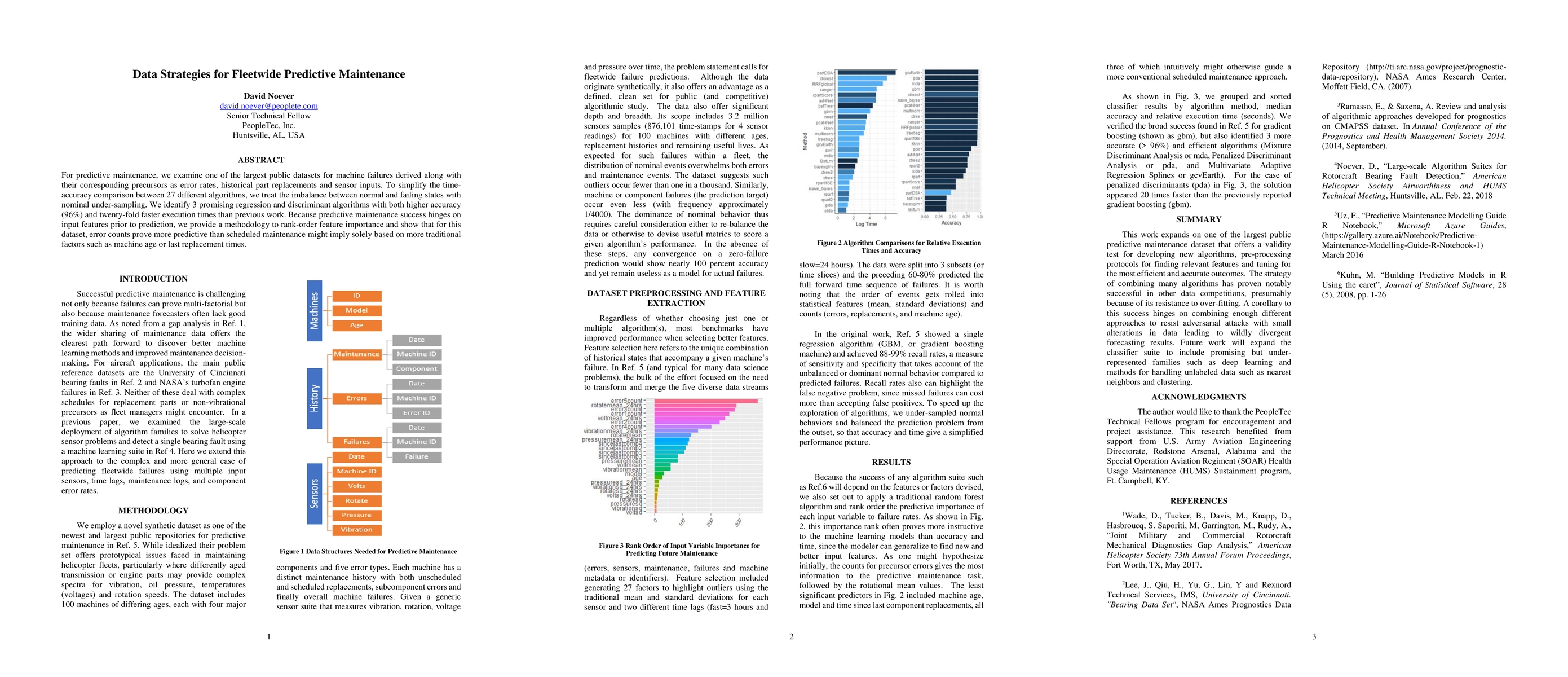 For predictive maintenance, we examine one of the largest public datasets for machine failures derived along with their corresponding precursors as error rates, historical part replacements, and sensor inputs. To simplify the time and accuracy comparison between 27 different algorithms, we treat the imbalance between normal and failing states with nominal under-sampling. We identify 3 promising regression and discriminant algorithms with both higher accuracy (96%) and twenty-fold faster execution times than previous work. Because predictive maintenance success hinges on input features prior to prediction, we provide a methodology to rank-order feature importance and show that for this dataset, error counts prove more predictive than scheduled maintenance might imply solely based on more traditional factors such as machine age or last replacement times.