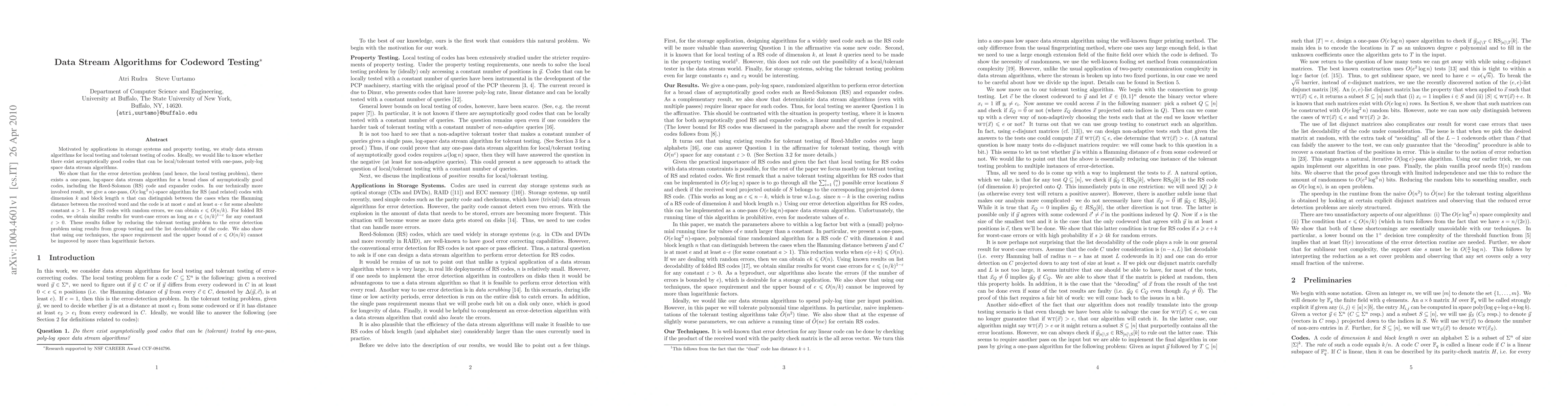Researchers have developed efficient data stream algorithms for testing codes in storage systems, showing that asymptotically good codes can be tested with limited space and time, enabling error detection and local testing.