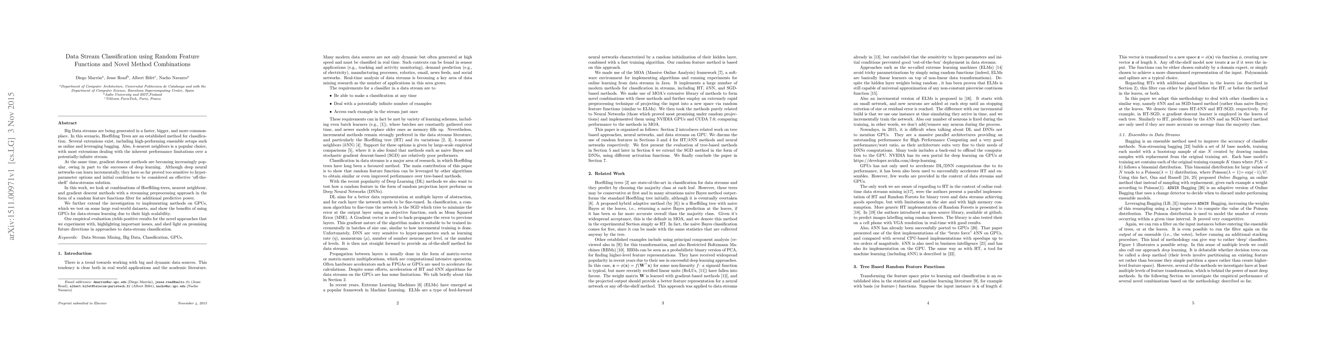 Big Data streams are being generated in a faster, bigger, and more commonplace. In this scenario, Hoeffding Trees are an established method for classification. Several extensions exist, including high-performing ensemble setups such as online and leveraging bagging. Also, $k$-nearest neighbors is a popular choice, with most extensions dealing with the inherent performance limitations over a potentially-infinite stream. At the same time, gradient descent methods are becoming increasingly popular, owing in part to the successes of deep learning. Although deep neural networks can learn incrementally, they have so far proved too sensitive to hyper-parameter options and initial conditions to be considered an effective `off-the-shelf' data-streams solution. In this work, we look at combinations of Hoeffding-trees, nearest neighbour, and gradient descent methods with a streaming preprocessing approach in the form of a random feature functions filter for additional predictive power. We further extend the investigation to implementing methods on GPUs, which we test on some large real-world datasets, and show the benefits of using GPUs for data-stream learning due to their high scalability. Our empirical evaluation yields positive results for the novel approaches that we experiment with, highlighting important issues, and shed light on promising future directions in approaches to data-stream classification.