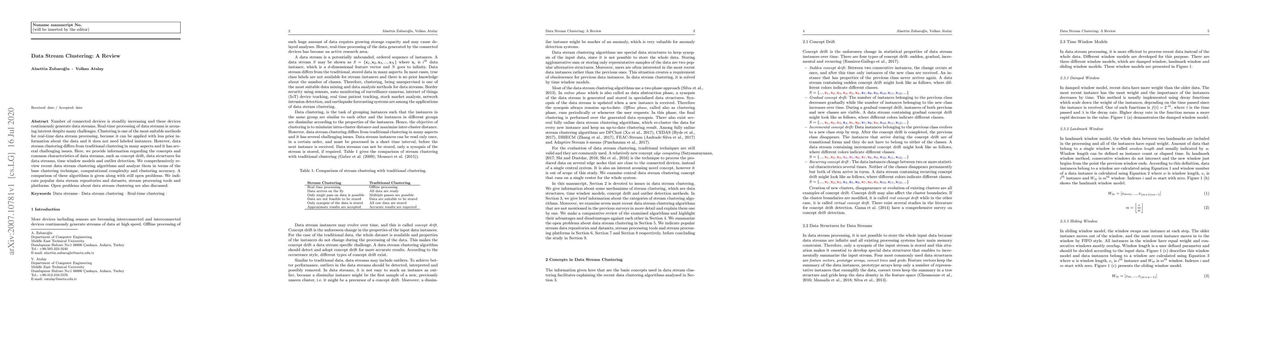 Number of connected devices is steadily increasing and these devices continuously generate data streams. Real-time processing of data streams is arousing interest despite many challenges. Clustering is one of the most suitable methods for real-time data stream processing, because it can be applied with less prior information about the data and it does not need labeled instances. However, data stream clustering differs from traditional clustering in many aspects and it has several challenging issues. Here, we provide information regarding the concepts and common characteristics of data streams, such as concept drift, data structures for data streams, time window models and outlier detection. We comprehensively review recent data stream clustering algorithms and analyze them in terms of the base clustering technique, computational complexity and clustering accuracy. A comparison of these algorithms is given along with still open problems. We indicate popular data stream repositories and datasets, stream processing tools and platforms. Open problems about data stream clustering are also discussed.