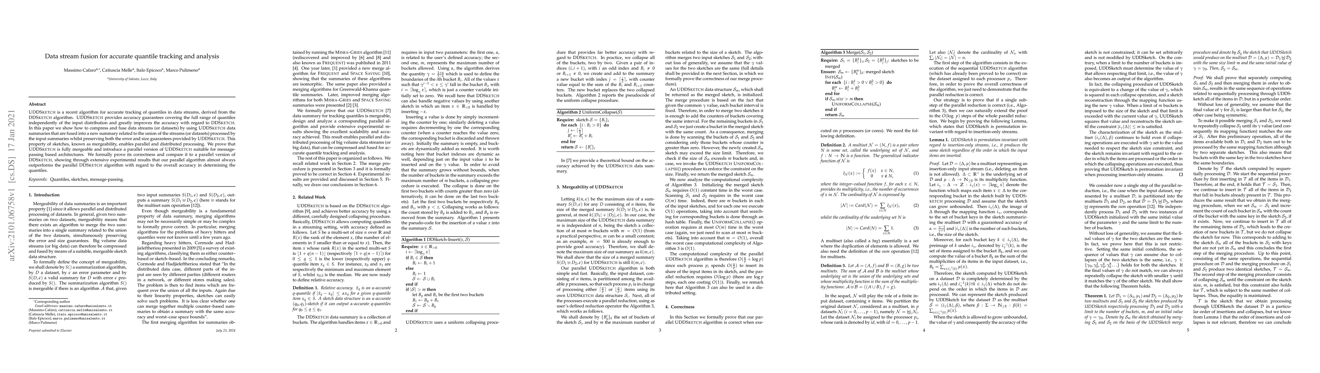UDDSKETCH is a recent algorithm for accurate tracking of quantiles in data streams, derived from the DDSKETCH algorithm. UDDSKETCH provides accuracy guarantees covering the full range of quantiles independently of the input distribution and greatly improves the accuracy with regard to DDSKETCH. In this paper we show how to compress and fuse data streams (or datasets) by using UDDSKETCH data summaries that are fused into a new summary related to the union of the streams (or datasets) processed by the input summaries whilst preserving both the error and size guarantees provided by UDDSKETCH. This property of sketches, known as mergeability, enables parallel and distributed processing. We prove that UDDSKETCH is fully mergeable and introduce a parallel version of UDDSKETCH suitable for message-passing based architectures. We formally prove its correctness and compare it to a parallel version of DDSKETCH, showing through extensive experimental results that our parallel algorithm almost always outperforms the parallel DDSKETCH algorithm with regard to the overall accuracy in determining the quantiles.